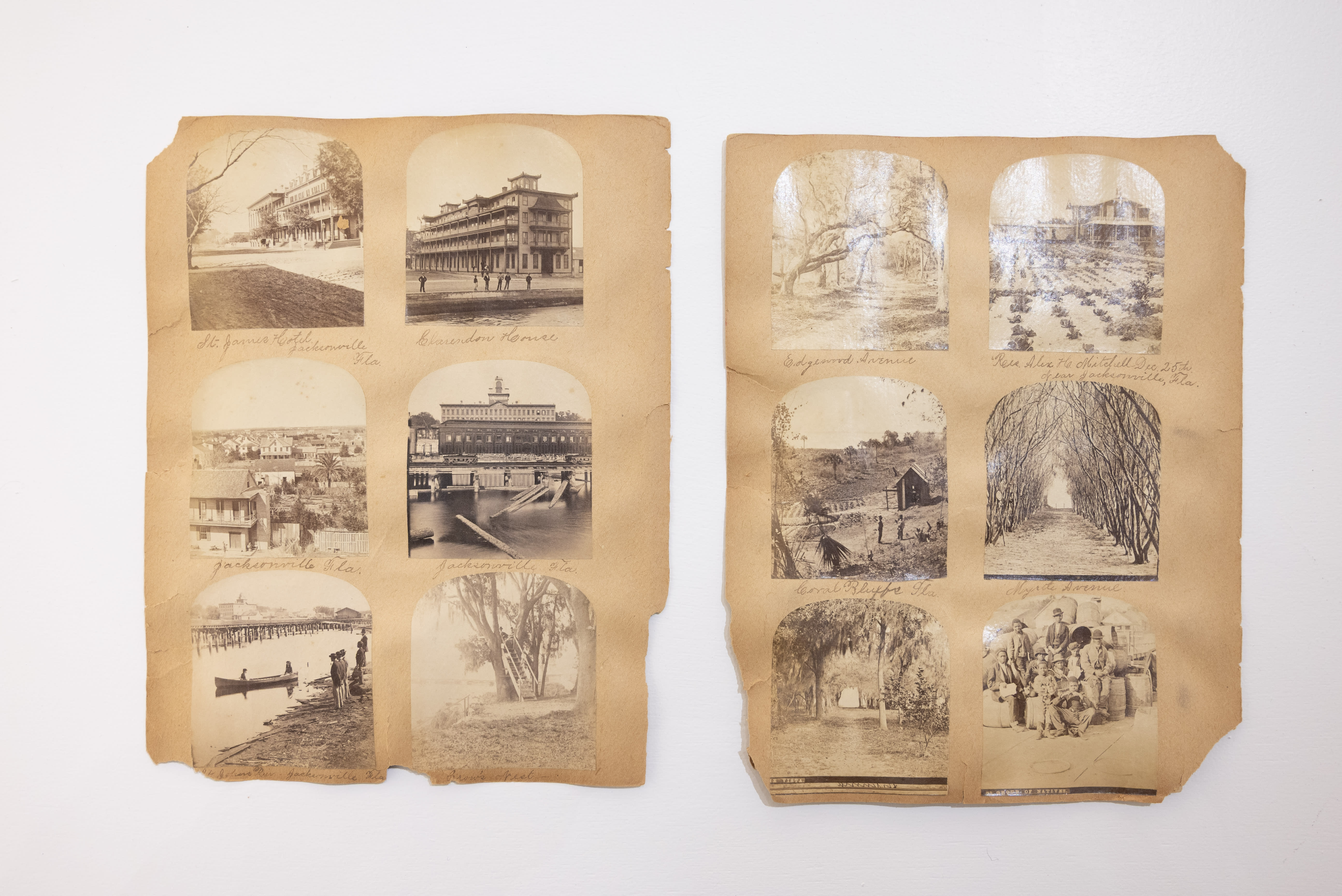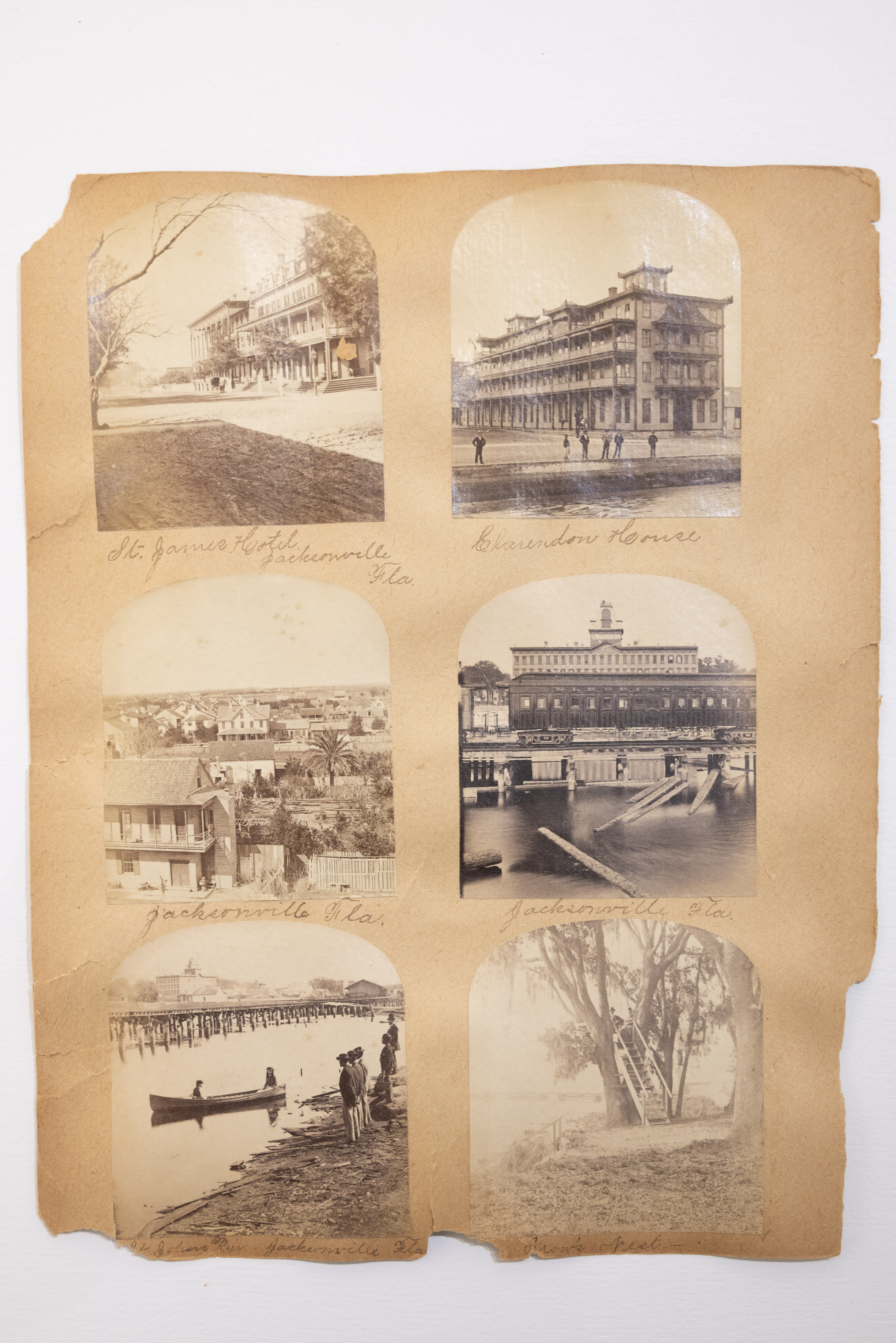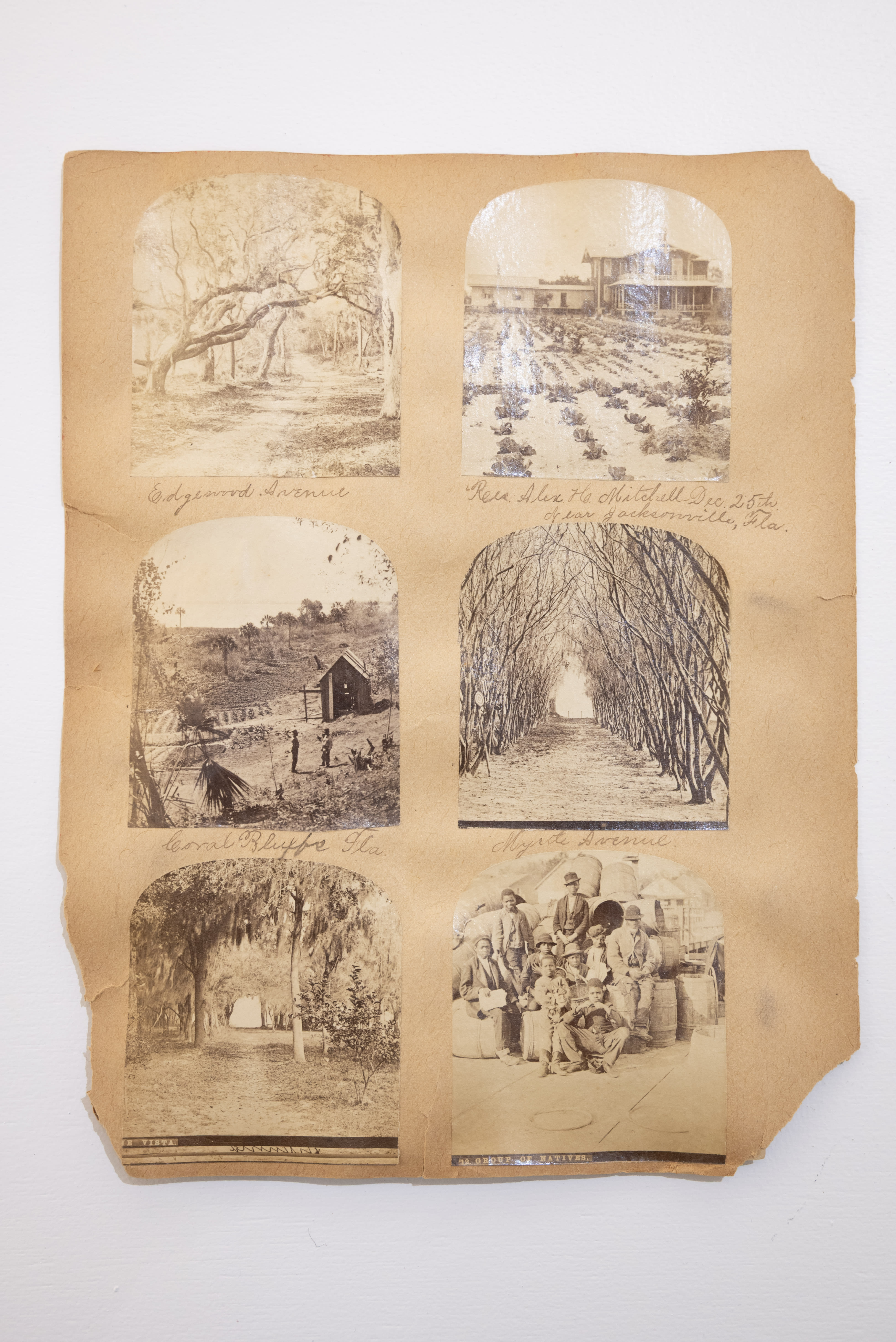 James Van Der Zee b. 1886 - d. 1983, Album page from the artist's personal photo album, with six mounted photographs, 1910. Captions: Landscape images captioned Jacksonville, FL