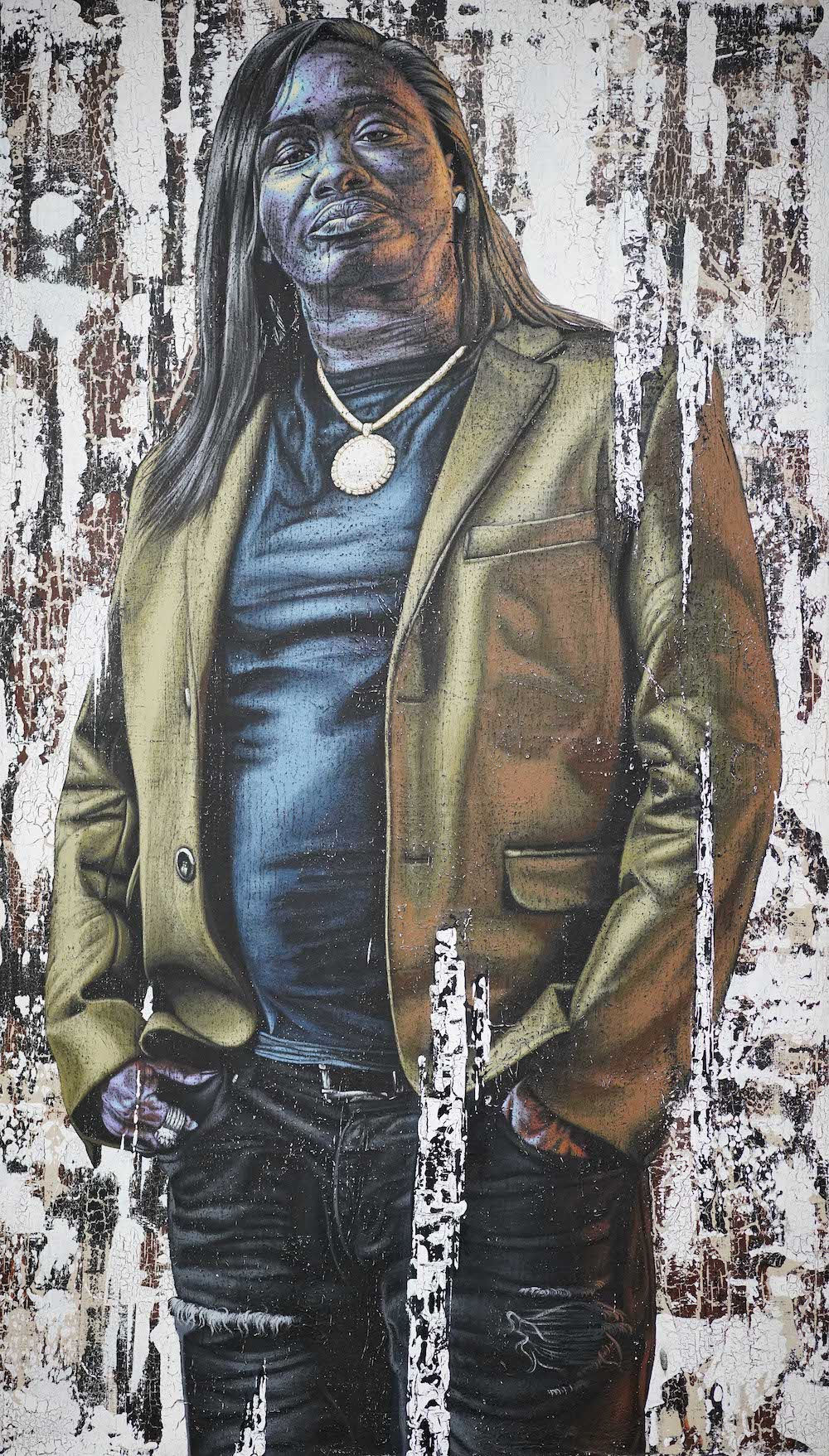 Conteh paints portraits of people he meets in and around Atlanta, Georgia, where he lives and works. He gets to know the people he paints; he learns about their personal histories, asks about their aspirations and the challenges they’ve faced. His portraits capture their outward countenance—their body, posture, and fashion—wIth photorealistic perfection, while his acrylic paints are augmented with earthen elements like soil, concrete, metal dust, and melted urethane in order to arrive at a deeper truth—elemental evidence of toughness amid dereliction.