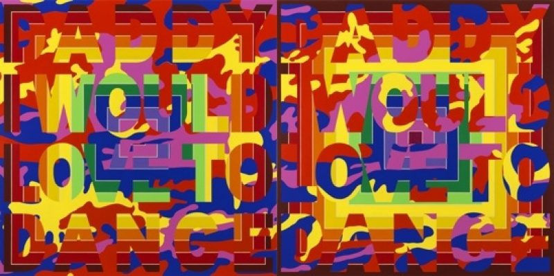 How do you choose which artists for which picture? In Frank’s Dilemma the camouflage comes from Andy’s camouflage paintings. Under the grid, and more or less concealed, are the concentric color images of Stella, and the text comes from where?