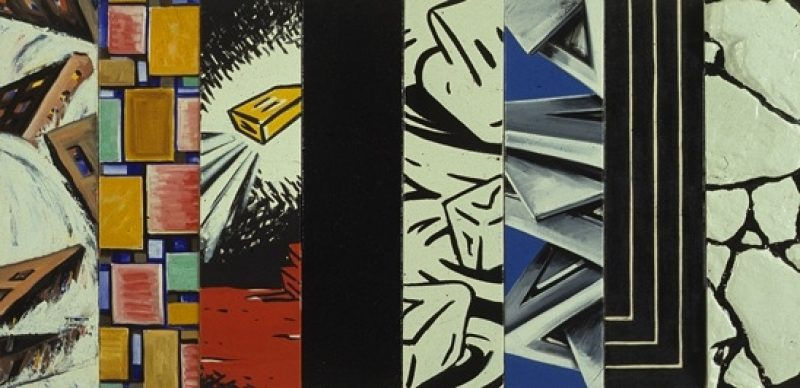 There’s sampling in this painting from 1989, titled Short Story II. The first panel is from an old landscape of mine, the first work I ever showed. Then, there’s a riff on ’20s and ’30s abstraction, which I love. Here’s Krazy Kat. This panel was actually a shiny, black stripe (paint with sand in it, I think.) That would be minimalism. Here are two more quotes from my earlier work. And then there’s, of course, Stella, and then Johns and Ashley Bickerton.