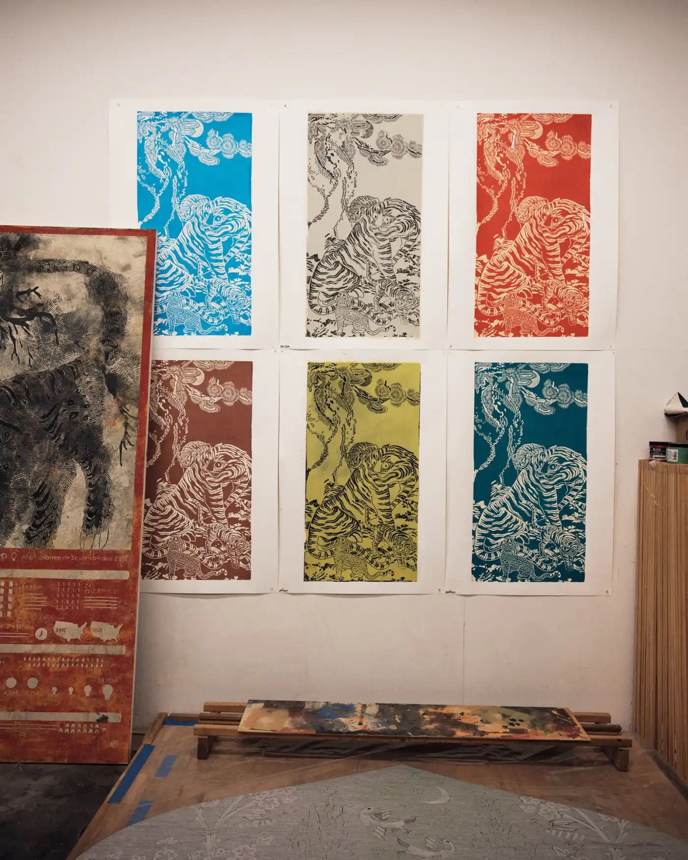 And in the south-west is Kour Pour. The 34-year-old British-Iranian artist (who is also newly an American citizen) was 17 when he first landed in LA with a plan to study music production, but he ended up side-stepping into fine art. From his studio in Inglewood – the area surrounding LAX airport and a focus of recent regeneration centred on the SoFi Stadium – he has built a practice that encompasses painting, printmaking and sculpture. “I’m telling my story of growing up in an immigrant mixed-race family and finding a place for yourself,” he says of the work recently shown at London’s Gallery 1957. Included in the exhibition New Homes, New Places were some of his intricately patterned and layered paintings of Persian carpets (inspired by the small carpet shop Pour’s father ran in Exeter when he was growing up), as well as a series of tiger paintings that roam across various landscapes, bringing with them different stylistic tropes.