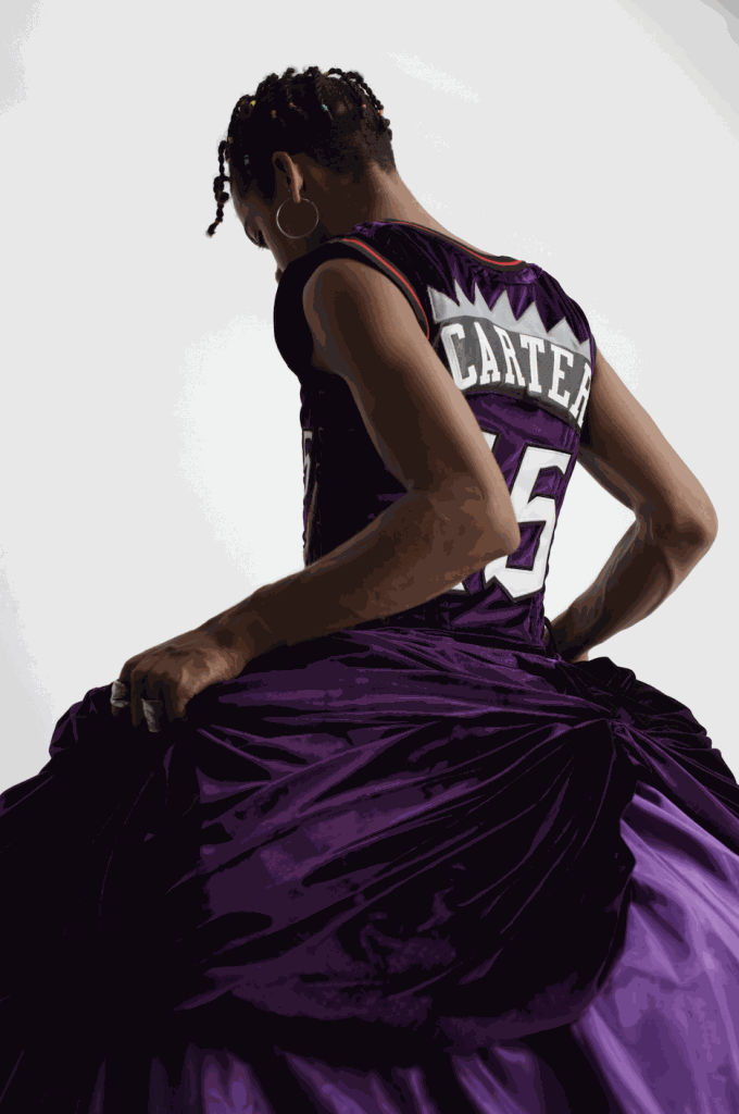 Mohamoud regularly uses basketball and football equipment to create strong images that probe the politics of Black bodies and Blackness. One of her best-known series, One of the Boys (2017–2019), transforms basketball jerseys into majestic Victorian-style dresses, complete with corsets and crinolines. The inspiration for these pieces came from her own childhood desire to dress like one of the boys by donning the jerseys of her favourite athletes. She recalls one particular argument in which her mother begged her to put on a dress before going out to play—Mohamoud complied with the request but then put a jersey on overtop. The striking set of photos of her wearable sculptures invites us to consider the ways in which professional sport shapes certain discourses around femininity and masculinity. She questions the heteronormative pressure exerted on athletic bodies, especially racialized bodies. What is acceptable femininity in sport? What are the consequences of the kind of hypermasculinity displayed in contact sports?
