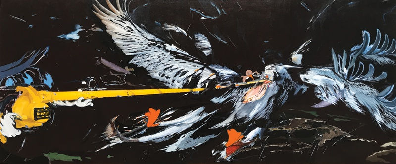 Su Su makes us work in these paintings and in DeWalt, 2017, she pushes our acuity to the limit, as we struggle to piece together this blasted image, as a bird’s delicate plumage is blown apart by an infernal leaf blower, wielded by the ghost of a cartoon character.