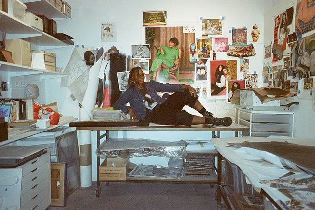 When you walk into Mickalene Thomas’s Brooklyn studio, your eye is drawn to large canvases overflowing with cheerful color. It isn’t until you get closer to the works that line the walls—many of which glimmer with rhinestones and portray in magnificent scale Black women’s daily lives—that you start to understand the current momentum behind the artist.