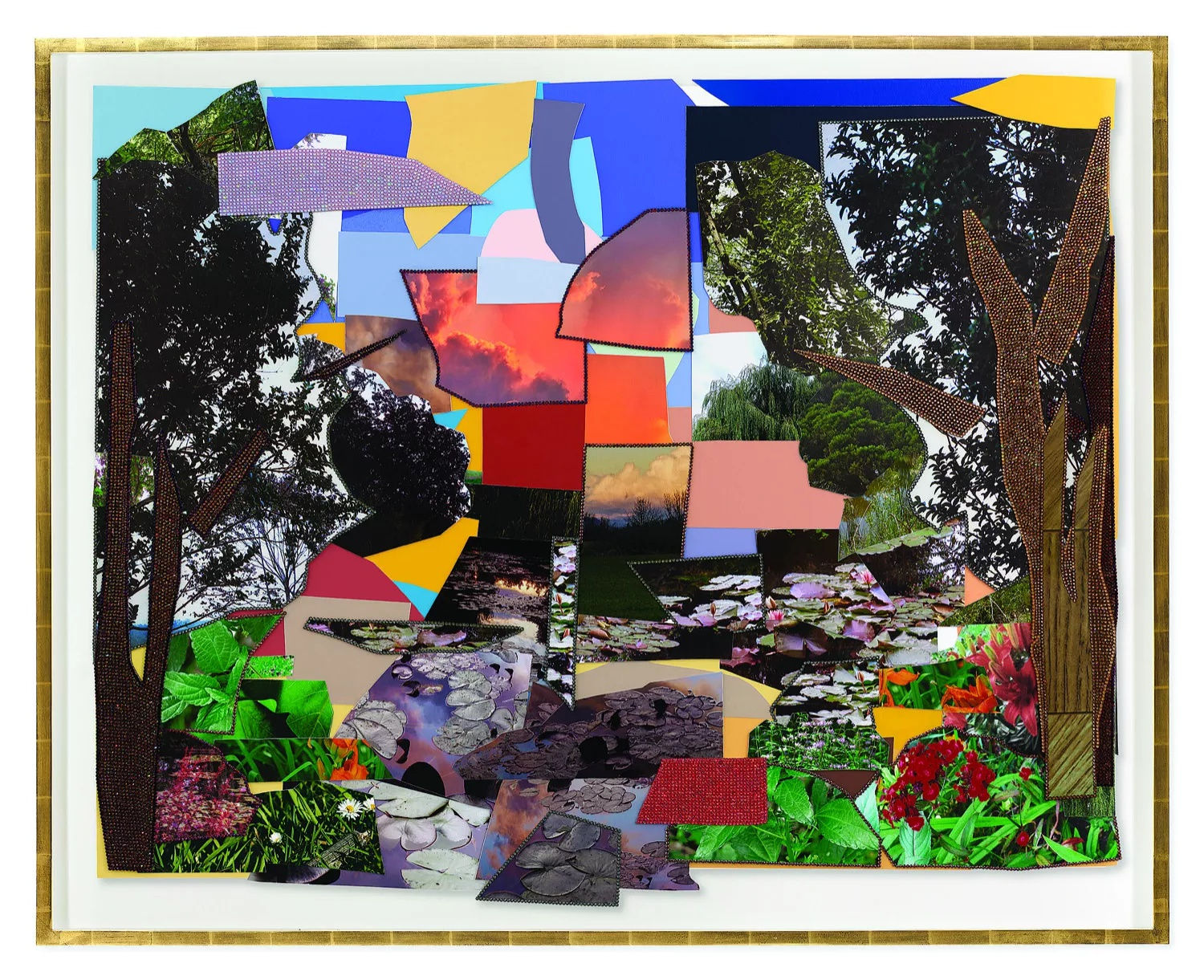 In response, Thomas produced her own works of rebellion: three new large-scale collages, one monumental painting, and an immersive site-specific installation featuring her 2016 video/sculpture Me as Muse. In the collages, Thomas makes herself at home in the rooms and outdoor environments Monet designed and drew his own inspiration from. By adding her trademark rhinestones and other bright elements, Thomas transforms Monet’s spaces into her own.
