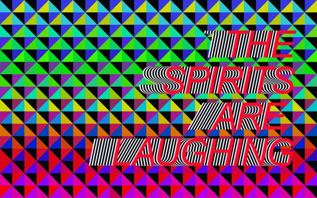 The video is an extension of one Gibson completed in 2015, which featured performers singing and dancing for, and on behalf of, objects in a museum collection. In this year’s production, he decided to focus on the landscape. He collaborated with the Rocky Mountain Color Guard Association, which celebrates its 50th anniversary this year, and musicians Lucien Dante Lazar and Ultra-Violet Archer, who wrote accompanying lyrics about natural elements like the sun, moon, stars, water, trees, animals, and mountains. While in the past Gibson has created flags, which he admits “can be loaded and are mainly about claiming things,” he has never produced them to this degree, particularly incorporating color guards, half of whom identify as indigenous. The flags carry messages like: Water Flows Through Me, Your Body Is My Body Is Our Body, The Trees Are Witnesses, and, of course, The Spirits Are Laughing.