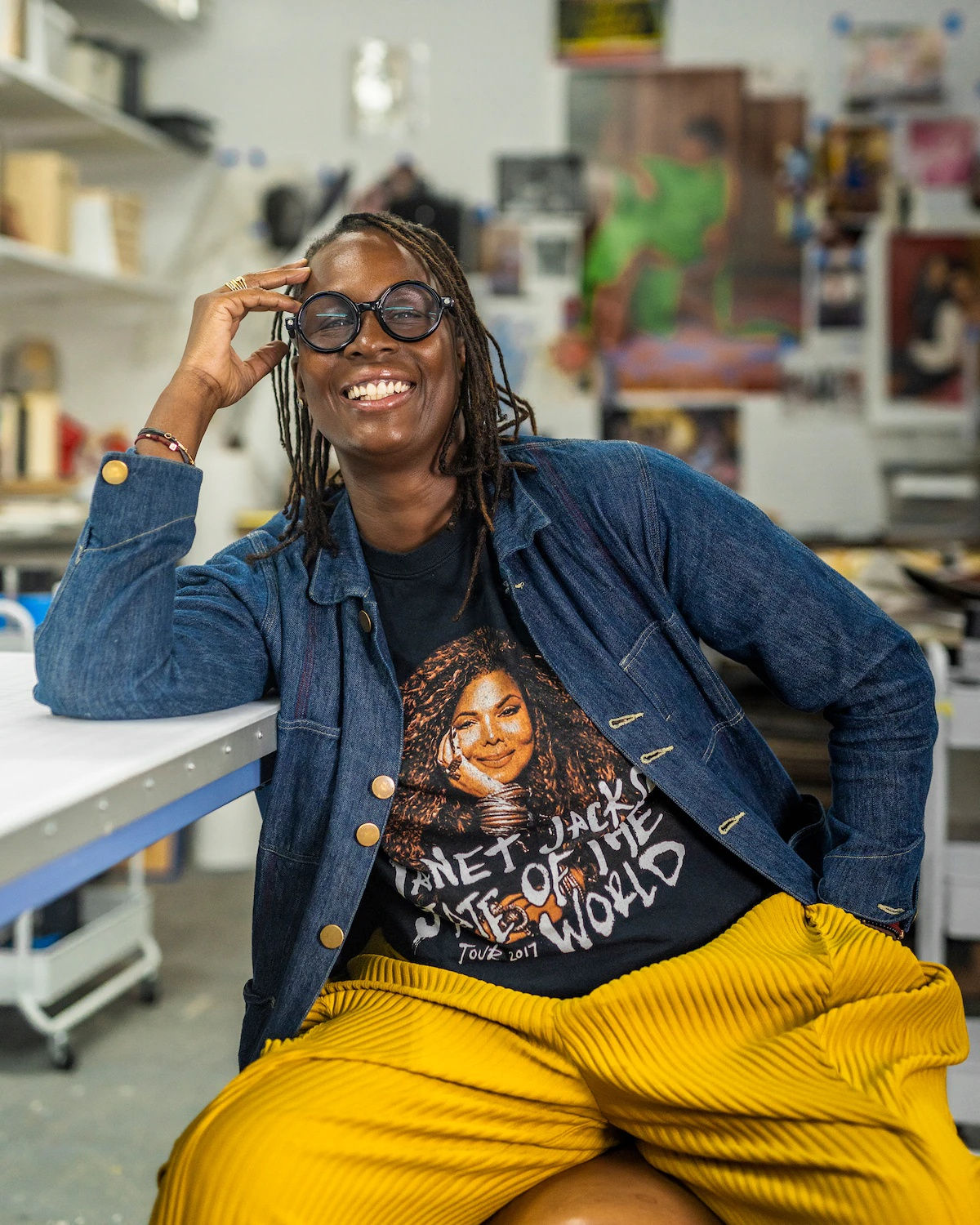 Little distinguishes the exterior of artist Mickalene Thomas’s Brooklyn studio from the surrounding businesses and buildings. Her workspace is on an unremarkable street in the Fort Greene area, and its entryway is partially obscured by a block-long matrix of scaffolding as well as a truck delivering fittings for a neighborhood gym preparing for its grand opening. There’s only a discreet posting near her building’s buzzer to indicate that behind these industrial doors lies a magical, kaleidoscopic world of paint, paper and paillettes depicting Black women in repose, Black women indulging in the luxury of self-assurance, Black women existing in a world of their own creation.