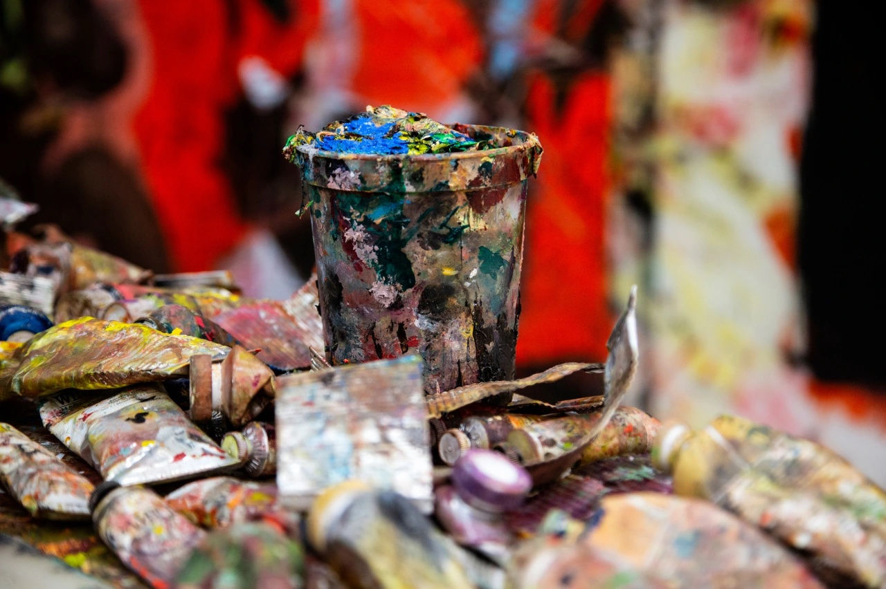 Memories are fallible, and Otero’s work represents the many forms that recollections can take: as a concrete snapshot, a composite scene, or through the gestural strokes of an emotion. Installed next to “Concerto” is “One Hundred Dreams From Now,” an abstract painting composed using many of the same colors depicted in paint buckets at the base of the piano.