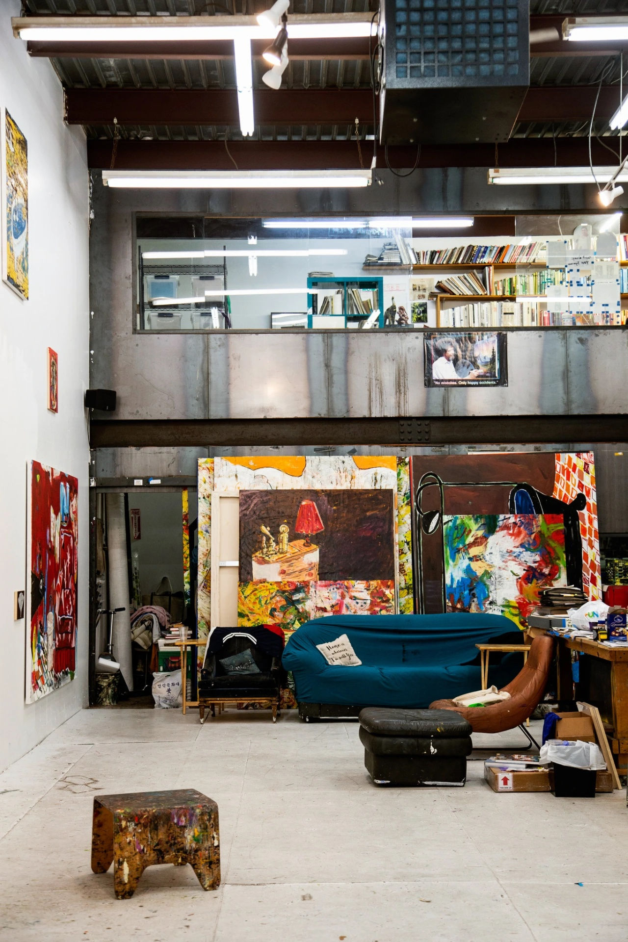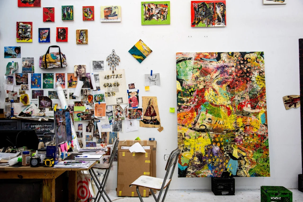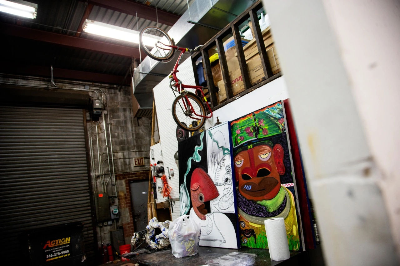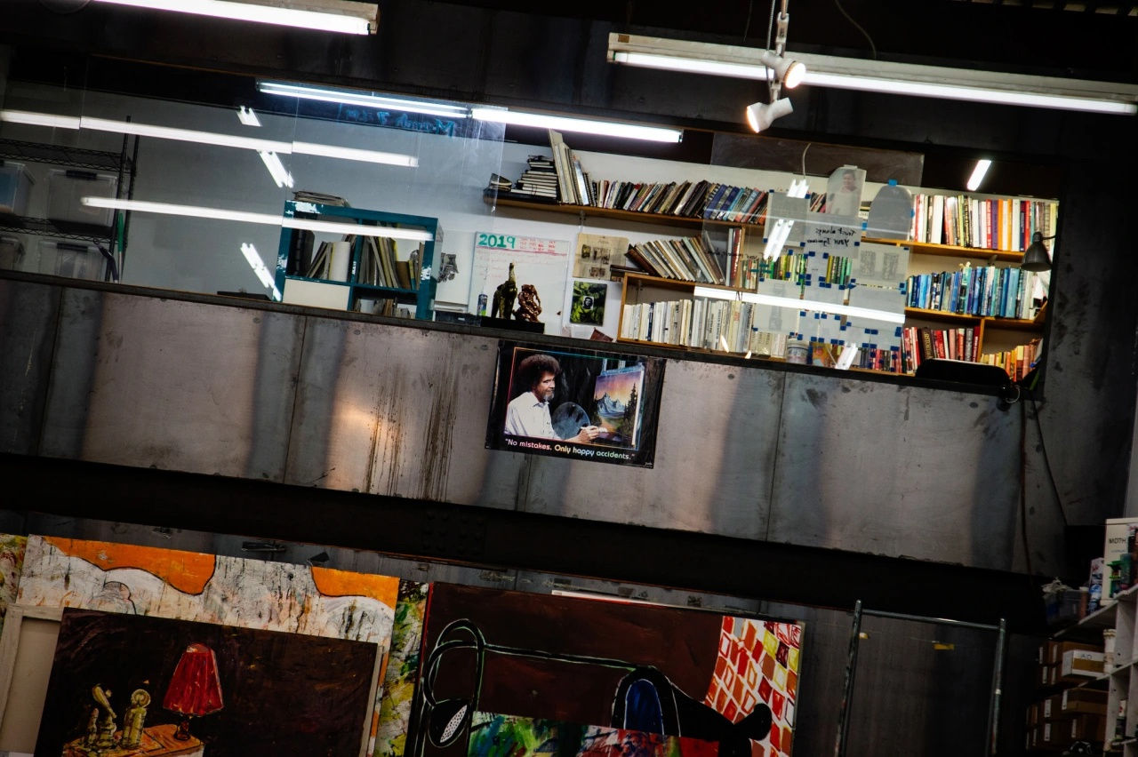 A poster of Bob Ross hangs above his studio couch bearing an inspirational quote — “No mistakes, only happy accidents” — and a nearby shelf houses a collection of gifted Bob Ross trinkets. The painter had a strong impact on Otero, who grew up in Puerto Rico watching his TV show. One day, he saw an advertisement for local Bob Ross-style classes, and he begged his mom to enroll him in the course. Otero went on to graduate from art school in Puerto Rico, and moved to Chicago in 2004 to get his MFA at the School of the Art Institute of Chicago. While in Chicago, he befriended another SAIC alum — Rashid Johnson, a close friend whose studio is around the corner in the stretch between Williamsburg and Bushwick.