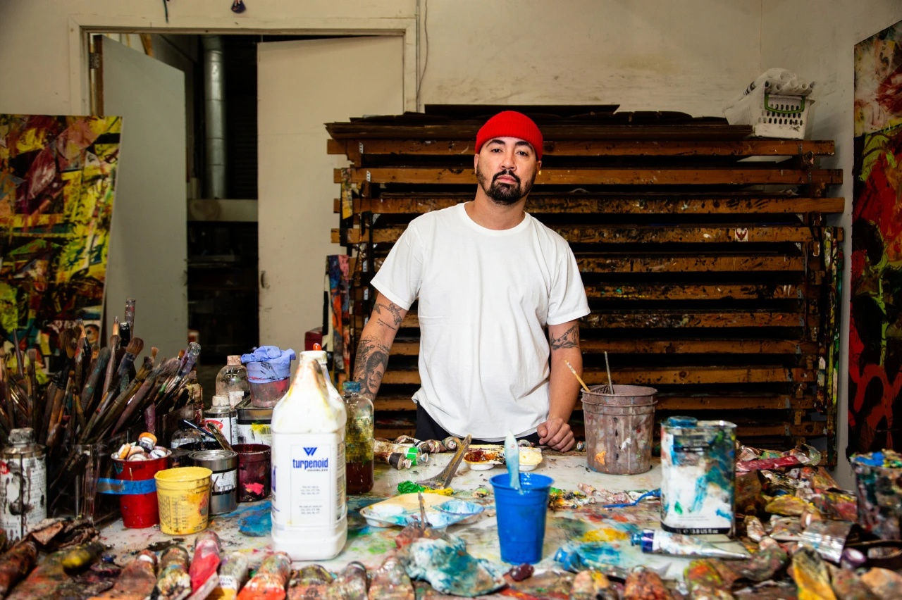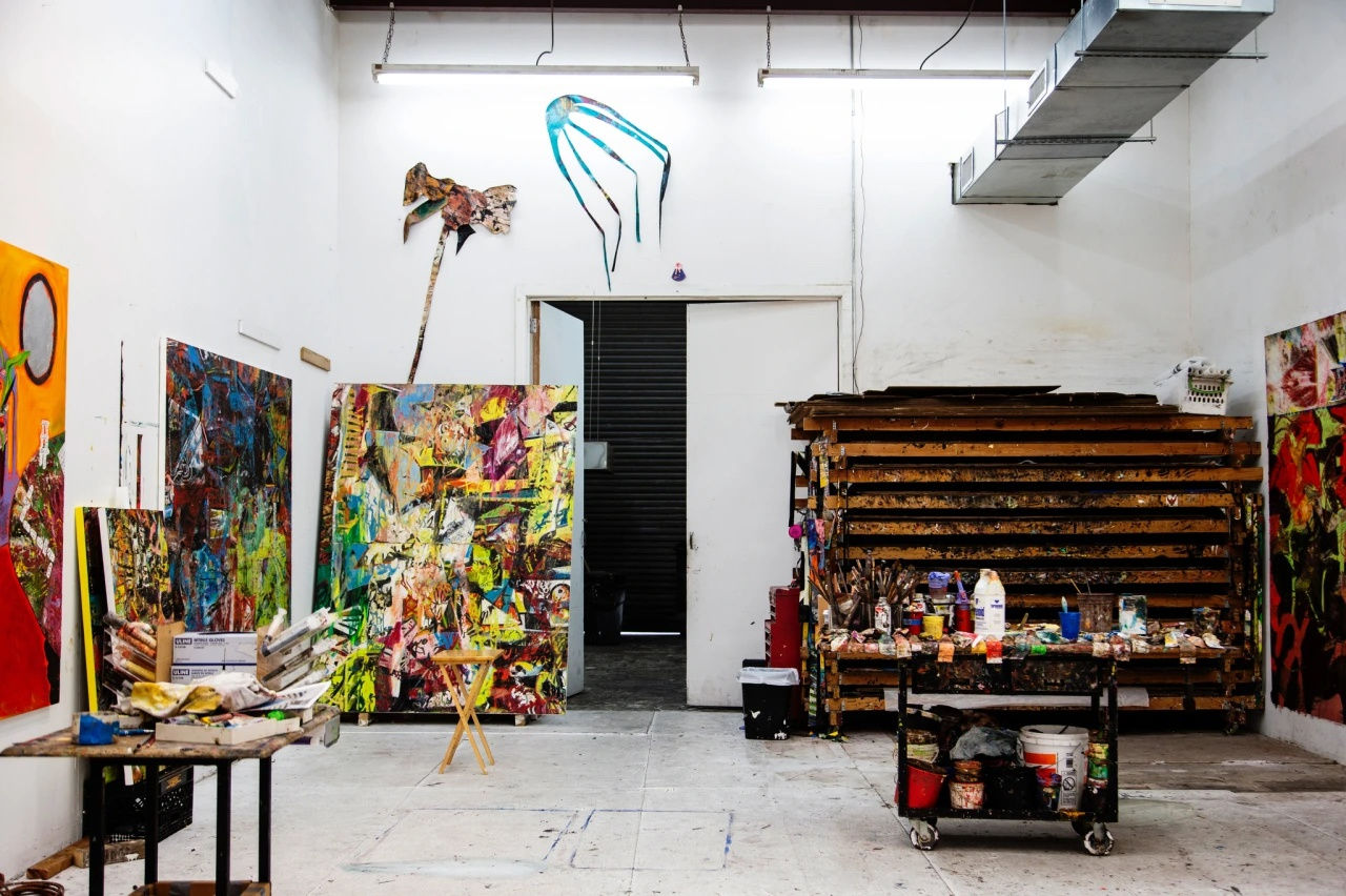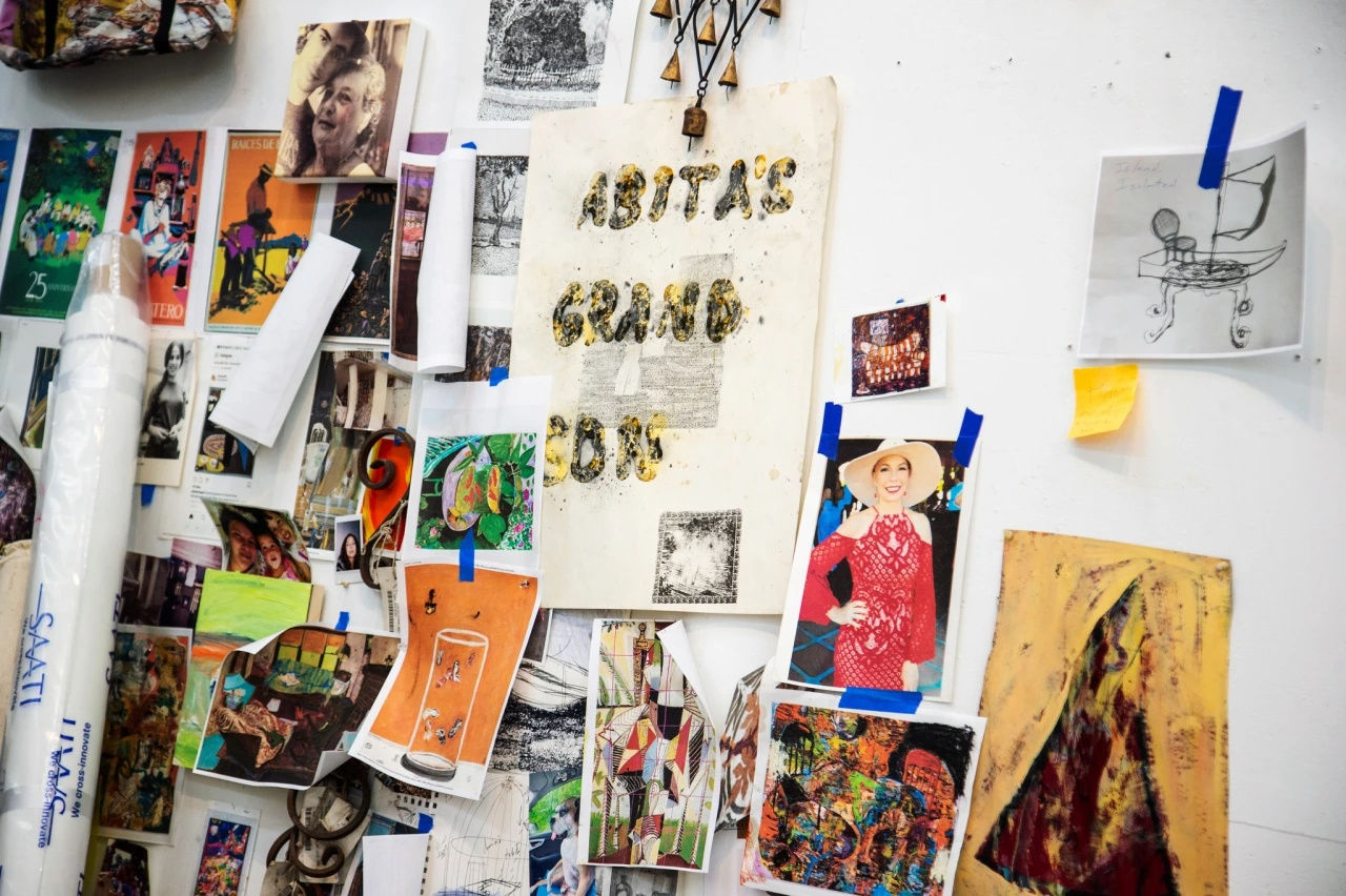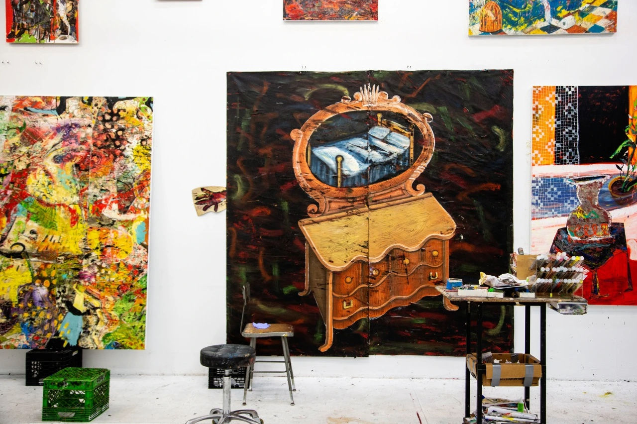 A poster of Bob Ross hangs above his studio couch bearing an inspirational quote — “No mistakes, only happy accidents” — and a nearby shelf houses a collection of gifted Bob Ross trinkets. The painter had a strong impact on Otero, who grew up in Puerto Rico watching his TV show. One day, he saw an advertisement for local Bob Ross-style classes, and he begged his mom to enroll him in the course. Otero went on to graduate from art school in Puerto Rico, and moved to Chicago in 2004 to get his MFA at the School of the Art Institute of Chicago. While in Chicago, he befriended another SAIC alum — Rashid Johnson, a close friend whose studio is around the corner in the stretch between Williamsburg and Bushwick.
