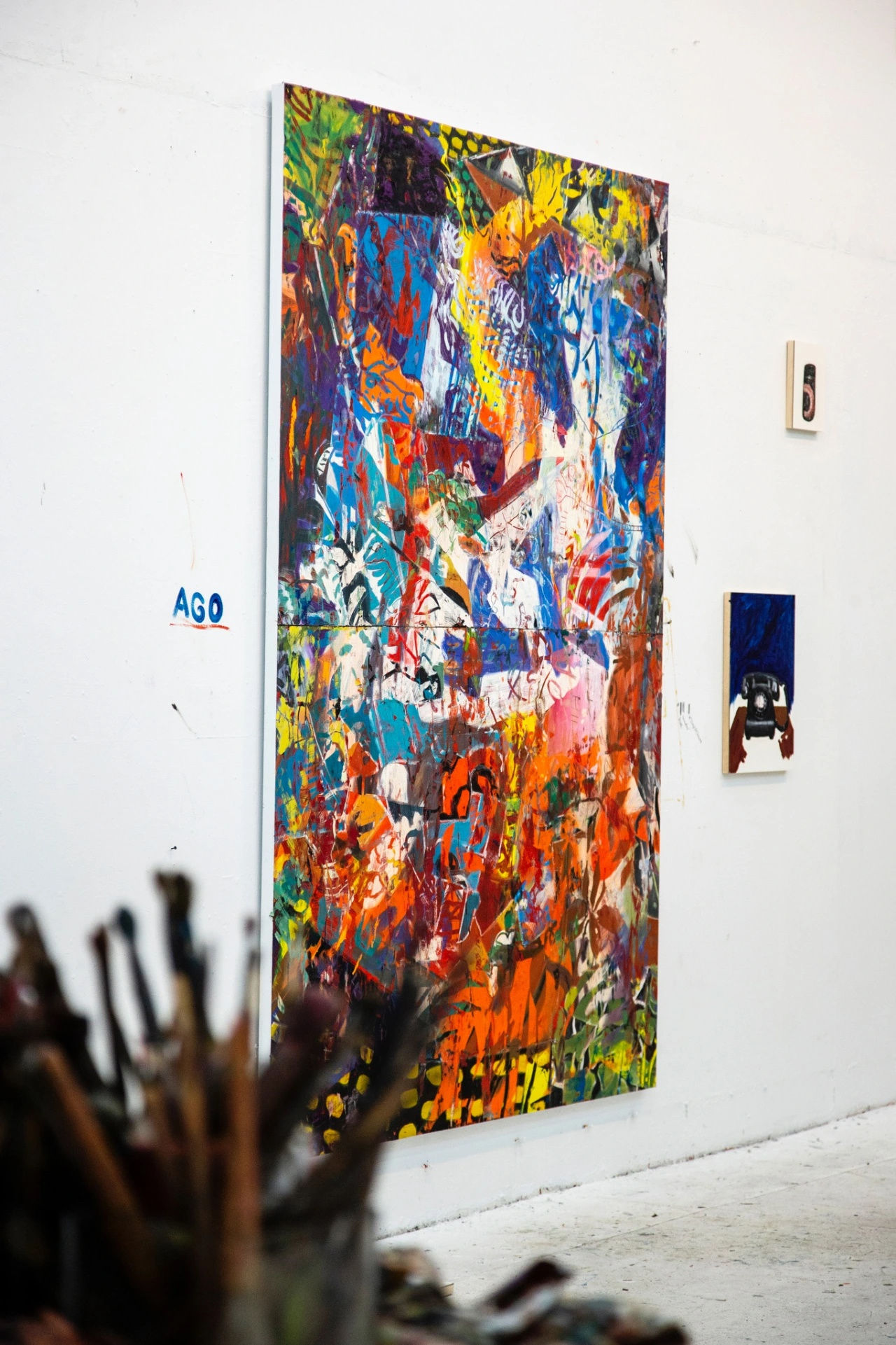 What’s left in his Brooklyn studio space reflects the artist’s past, present and future career: one wall houses new small canvases depicting individual objects (a fan, dentures, a rotary phone) painted at scale; a large abstract composition, which he has become known for, is nearby. And hanging over the room’s doorway are several shapes akin to jellyfish, cut out and affixed directly to the wall. They’ve been up there for years, and Otero notes that he’s recently been thinking about returning to the idea.