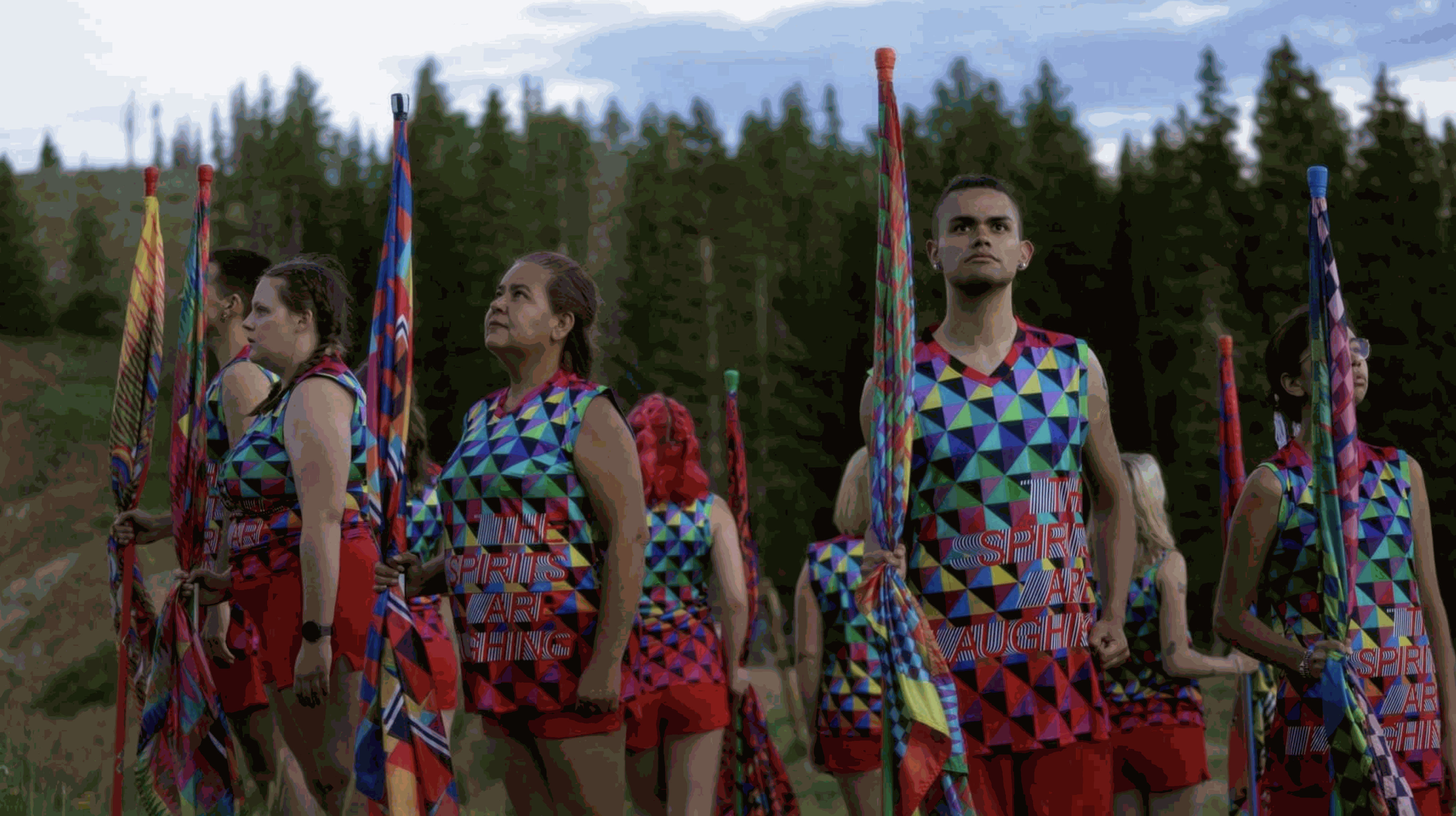 From left to right: Leo Balcer, Megan Templeton, Anna Daugherty, Ryan Vela, and Mazhone Morgan. Jeffrey Gibson, The Spirits Are Laughing, 2022. Images courtesy Jeffrey Gibson, Sikkema Jenkins & Co, New York; Kavi Gupta Gallery, Chicago; Roberts Projects, Los Angeles; and Stephen Friedman Gallery, London. Brett Novak/Photo Credit