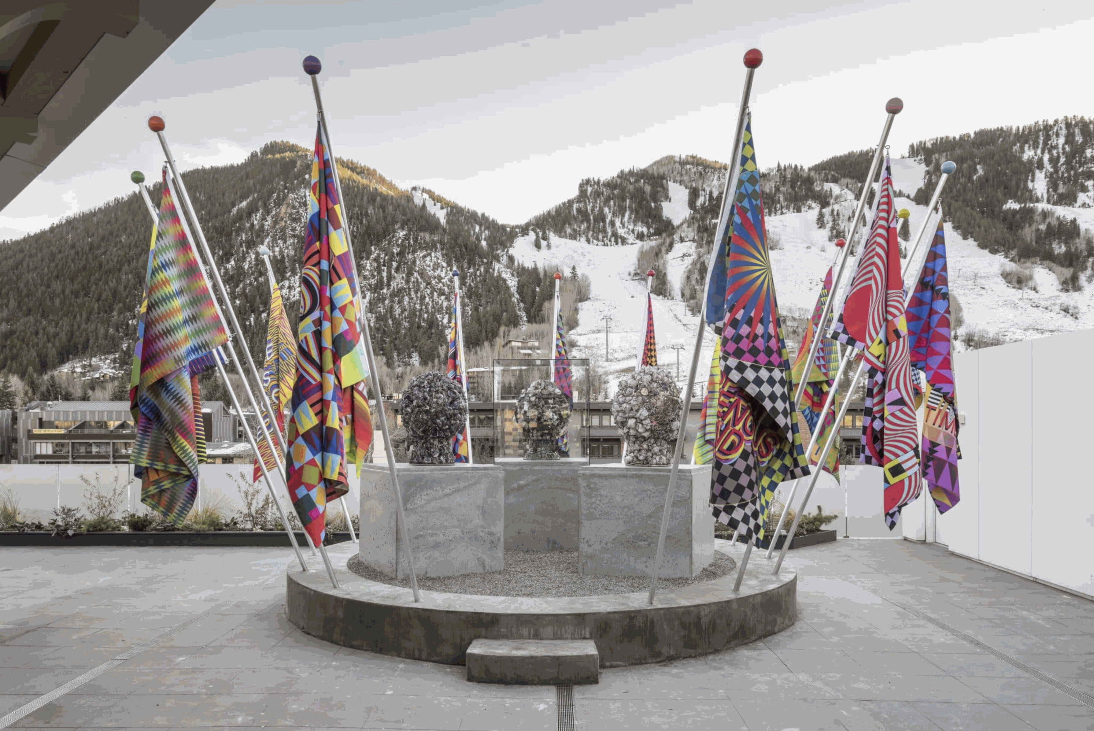 From Colorado Springs-born artist Jeffrey Gibson, on the rooftop of the museum, visitors will find The Spirits are Laughing, a new site-specific sculpture represented by an assemblage of three anthropomorphized heads that incorporate stones, fossils, and other natural materials, grouped with his signature brightly-colored flags, each with a different pattern and text.