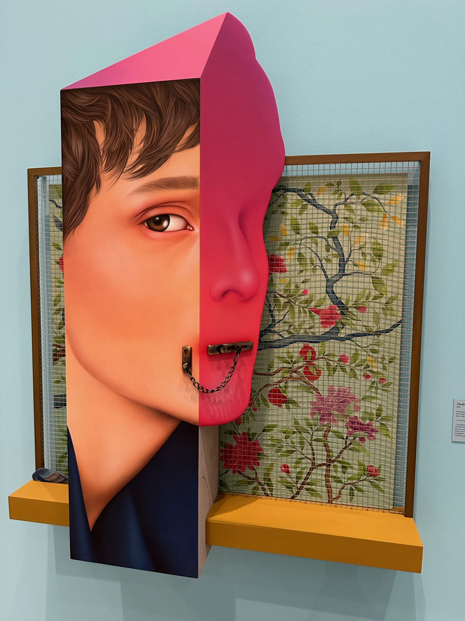 “The Enclosed Garden” (2021) perfectly encapsulates the strength of her aesthetic. The figure, if we can call it that because it is only a fragment of one, is seemingly silenced by a door chain lock, suggesting home isn’t safe, while a metal screen obscures the beautiful floral pattern behind. In “True to Self” (2023), she directly references a Safavid-era helmet in a Scottish museum, and places her image (or what she calls ‘alter egos’) in relation to it, bringing together two things that historically may not have been found together. Then she places it all on a missile-like form staring at a mirror that reveals her eyes in the reflection. It’s a visceral moment.