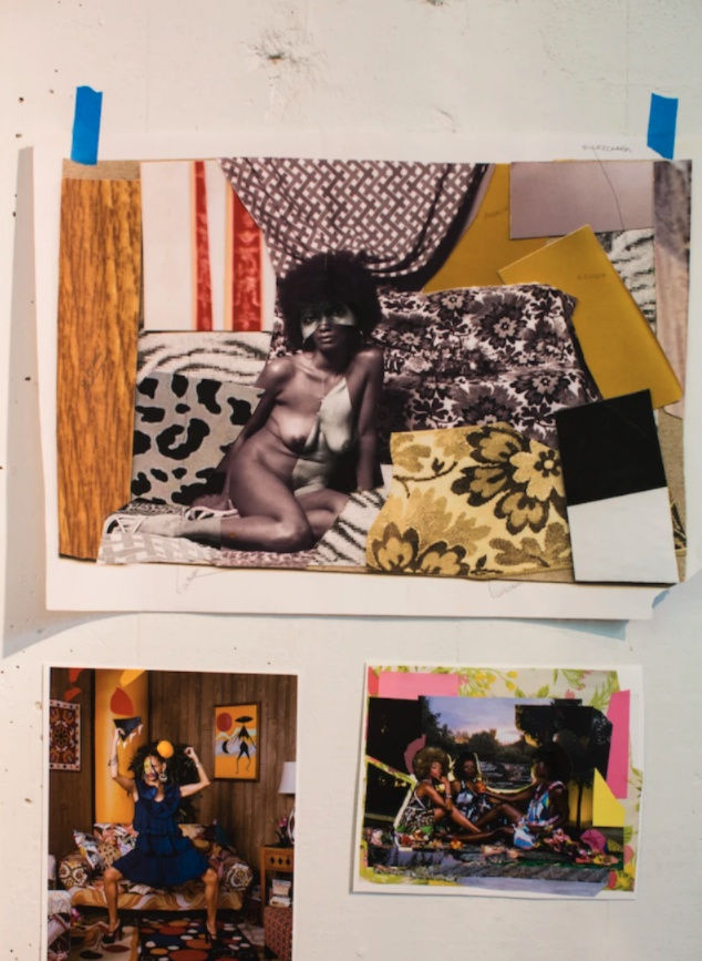 She creates portraits of everyday black women and notables like Oprah, Michelle Obama, and Solange Knowles. Through her gaze, black women are powerful, beautiful, all-encompassing. We're the sole inhabitants of the collaged, painted, and bejeweled world she renders in her works. Thomas depicts us posing like classical nudes and posting like 70s Blaxploitation pin-ups.