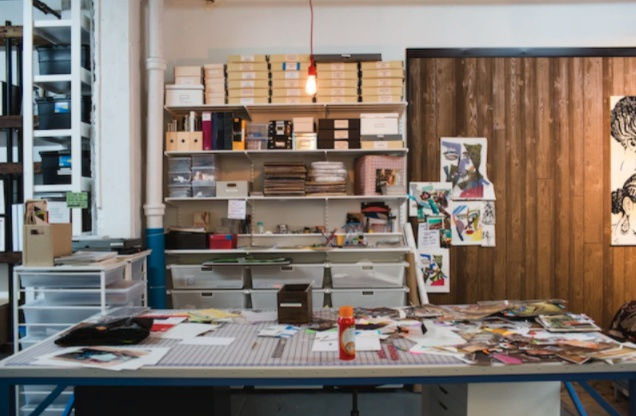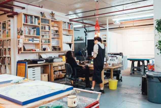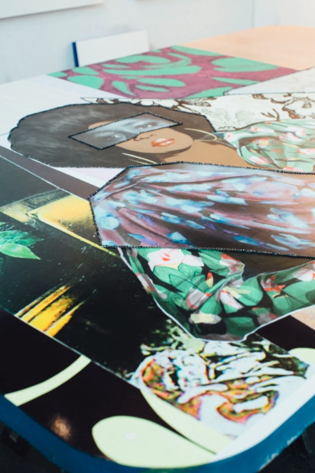 The New Jersey-born artist's studio is a tidy, spacious machine. As she shows me around, she stops at one workstation or another, observing the work of her assistants, telling them she liked the way the work was coming along. We pause before a giant collaged work that spans the greater part of one of the studio's walls. It's a classic Thomas—a beautiful afro-wearing woman leans back on a couch, one leg planted on the floor, the other lifted in the air. It's a version of her piece Racquel Reclining Wearing Purple Jumpsuit, a mixed media collage using elements of a photographed portrait of Thomas's partner, Racquel Chevremont.