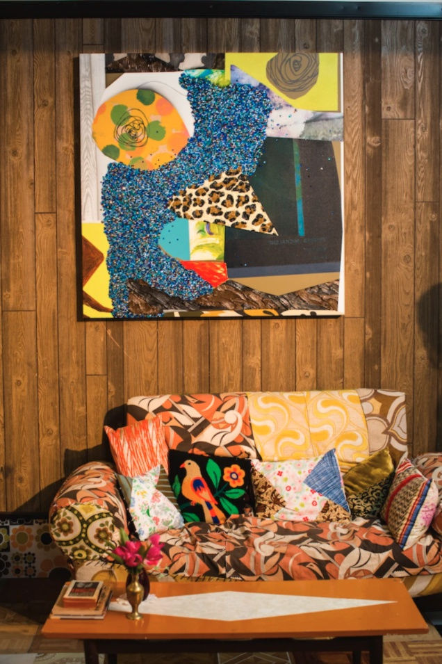 Thomas made the slipcovers that jacket the set's chairs and couches. She visits Salvation Army shops and thrift stores looking for fabrics that catch her eye. Old house dresses are among her favorite sources for cloth. "I love using house dresses, my grandmother used to wear house dresses," she says. "Do you know why? Because there is something about the fabric and the softness from women wearing it that I love." My grandmother and great aunts loved wearing house dresses too, so I know exactly what Thomas means. Housedresses are icons of a powerful domesticity, of knowing matriarchs. By incorporating them in her work, Thomas taps into a tradition of commanding womanhood.