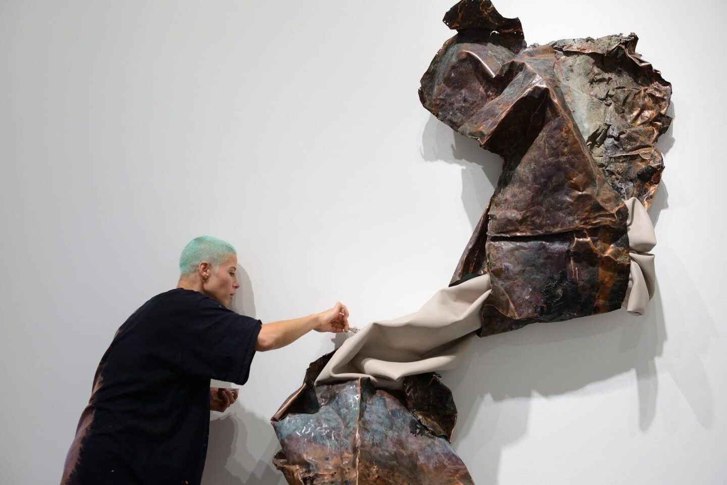 The copper metal material in her latest exhibition, she says, is instinctively chosen like a partner in a dance where she domesticates it through a miracle of a new aesthetic life, where it gets paired and embraced by these very sensual “painting skins.” The artist uses her background of painting to add colorful and metallic details to her “skins” that transform the feel of harsh, heavy, “masculine” mediums to an interpersonal relationship with Yanko’s technique and perception, which has changed over time.