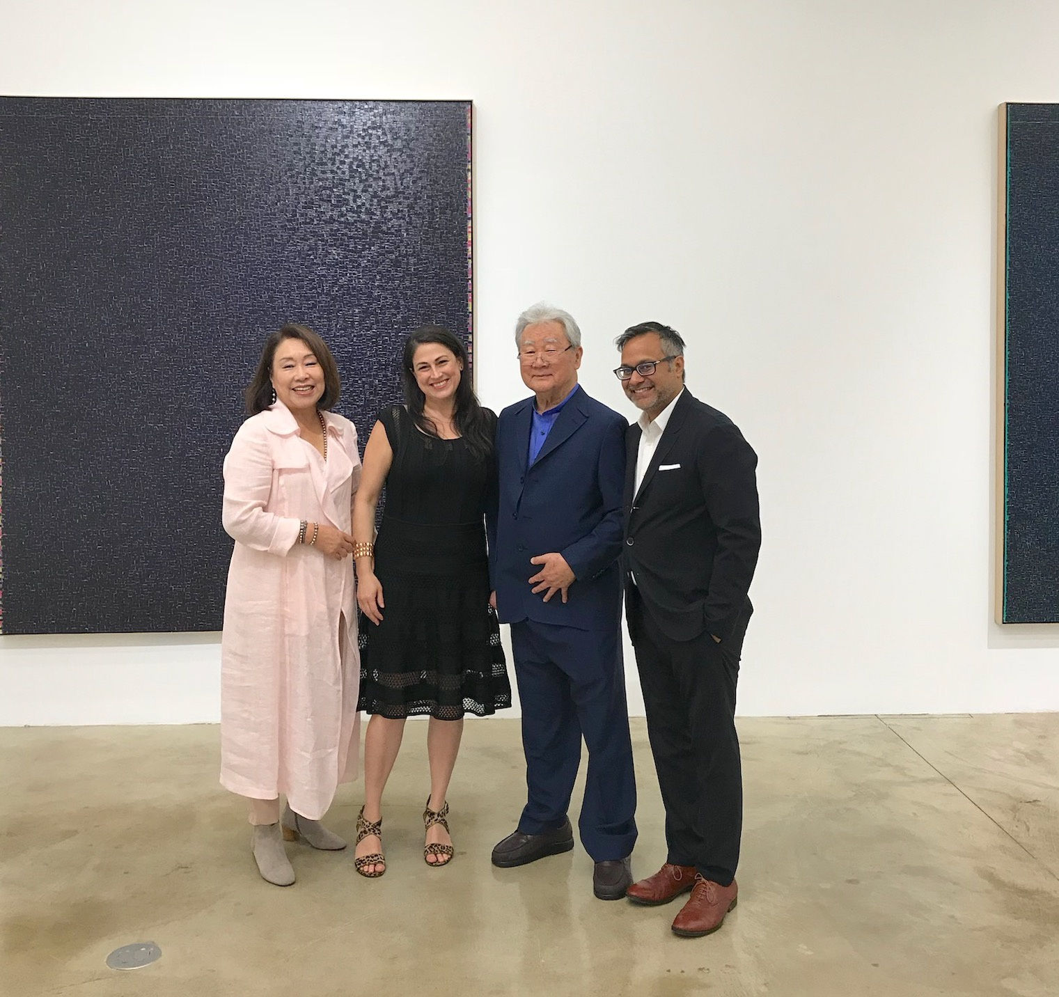 Young-Il Ahn with, left to right, Soraya Ahn, Jessica Moss, and Kavi Gupta at the opening of Young-Il Ahn's solo show at Kavi Gupta in 2018.