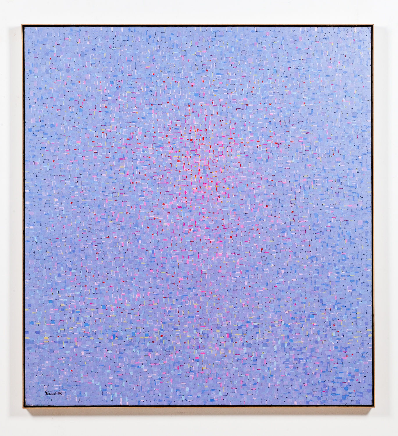 But it was Ahn's beguiling "Water" series, which he developed in the latter part of his career, that secured his place in recent art history. Using a knife to apply repeating blocks of oil paint atop fields of color, he created meditative pictures in which light shimmers and space is in flux. Tiny magenta rectangles dance atop sky blue, or jet-black ones struggle to contain a deep lilac, with minute daubs of other colors enlivening the scene in some cases.