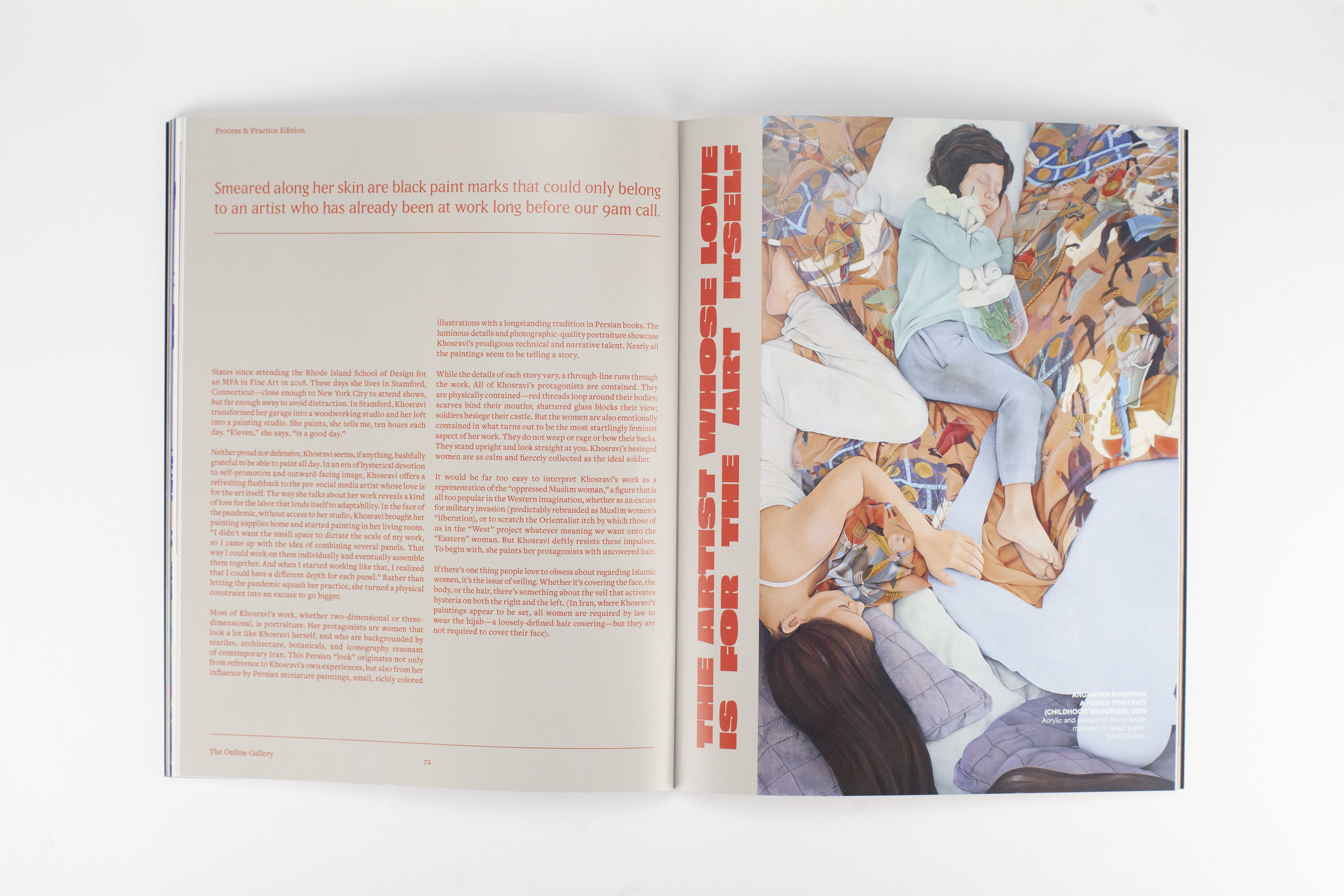I ask Khosravi if, by painting women without the hijab, she is rejecting Western assumptions that Iranian women cover their hair. “I don’t think about that expectation that much,” she answers. “Because, again, that can also be limiting, right?” What’s more interesting to Khosravi is representing contradiction, the experience of living a double life. She explains that, “in Iran, we are forced to wear a hijab in public but not in private. I grew up with parents who drank alcohol and listened to rock music, but I couldn’t speak about these things at school. Everyday life is a contradiction.”