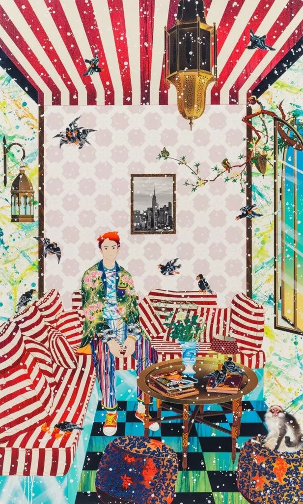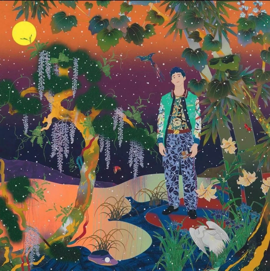 Another Believer (2021) is part of Matsuyama’s “Fictional Landscape” series (2021–present), his signature body of work that represents the in-betweenness he’s felt and been inspired by, given his own cultural background. The motley-colored fantastical landscapes fuse nature with the cosmos, sample compositions from classical Western paintings and popular fashion alike, and are often populated by flora and fauna characteristic of the Edo period. With each piece, Matsuyama blends together a variety of visual culture—advertisements, logos, magazine covers, modern art—and channels it all into the figures, textiles, and decor that are rendered through intricately layered brushstrokes.