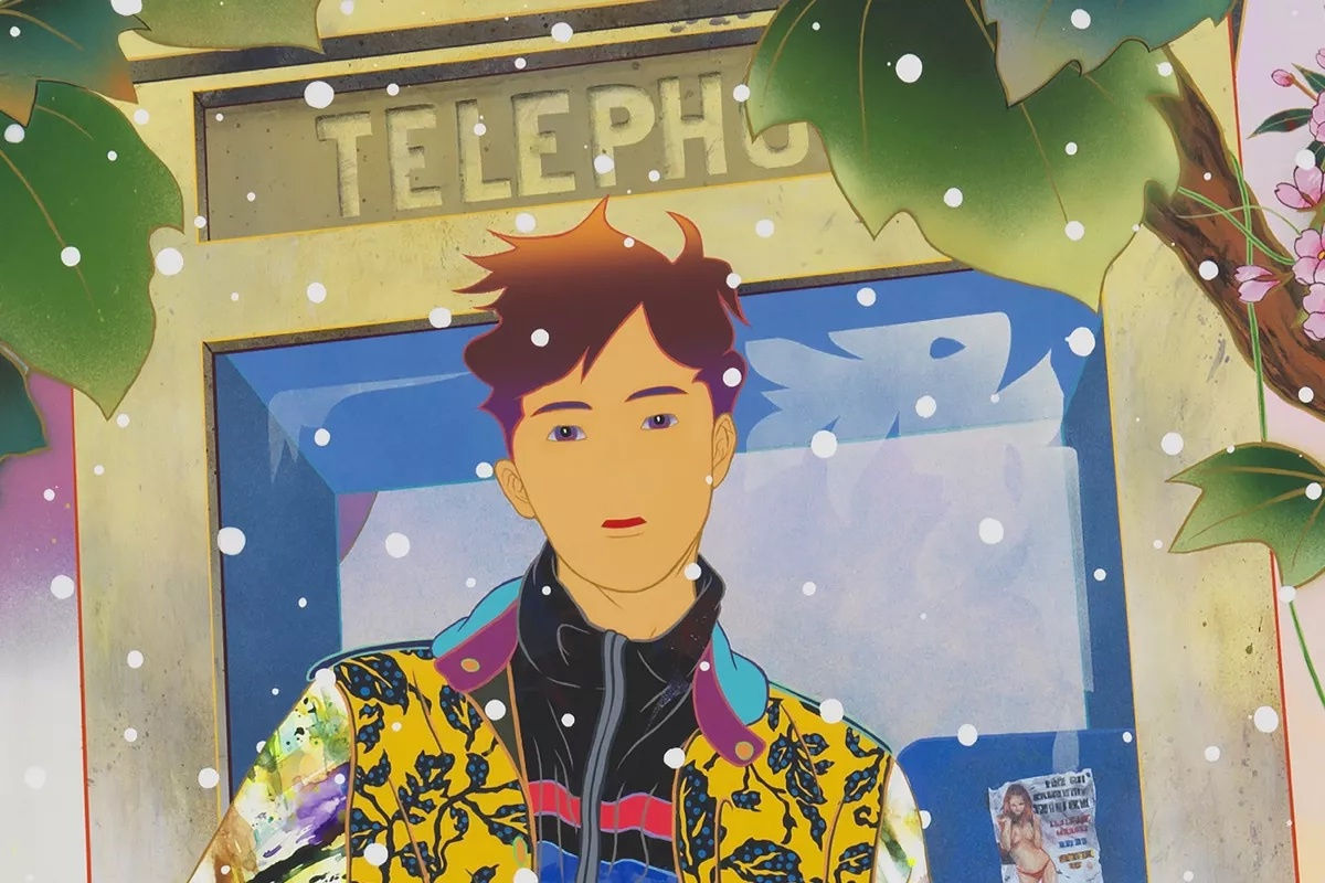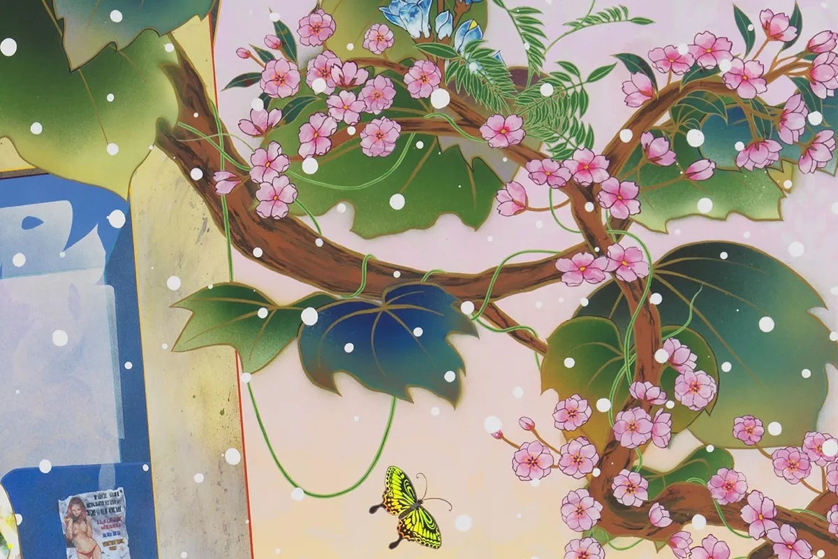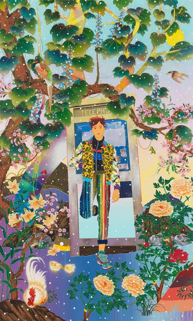In Another Believer, we see a figure exiting a phone booth, which may recall to some the popular British TV series Doctor Who (1963–present). The booth is emerging from or sinking into a body of water, surrounded by an exuberant array of blooms, snowflakes, and trees. Matsuyama’s figure appears between worlds, galaxies, and time periods as he steps out into the world, wearing the freshest of outfits, which places him in the 21st century. This grounding in the present is amplified by the array of swimsuit magazines plastered inside the phone booth.