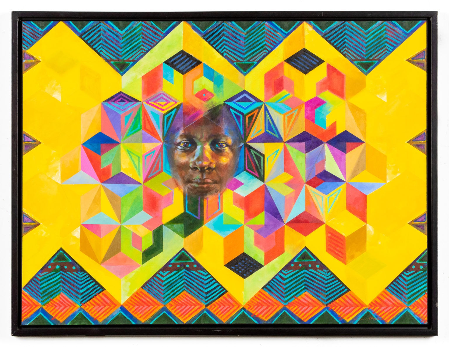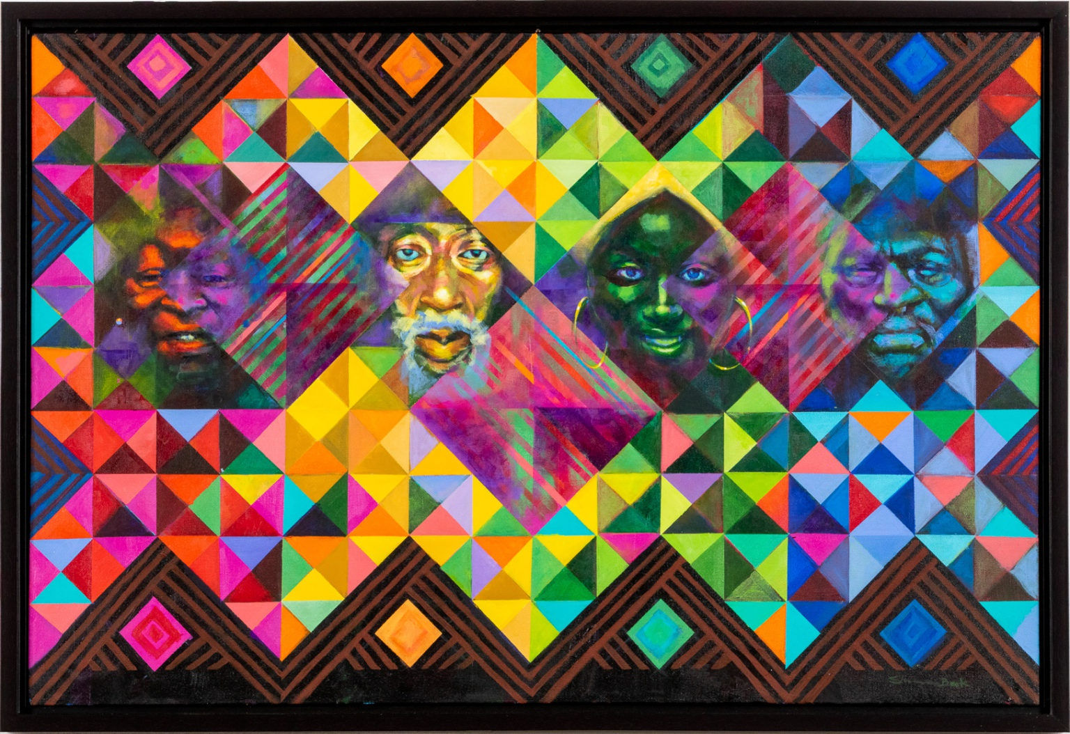 In Ancestors, a series of untitled works from the 1990s, Beck juxtaposes traditional African masks, labeled as if in a museum display, alongside contemporary Black faces. He challenges the viewer’s perception of reality and the imagination, combining realistic characteristics with vividly patterned backgrounds or portraying visages in bold geometric abstraction. The subjects of his portraits, which include historical figures such as Shirley Chisholm, the first Black woman elected to the United States Congress, or Frederick Douglass, the national abolitionist leader and social reformer, always gaze directly at the viewer.