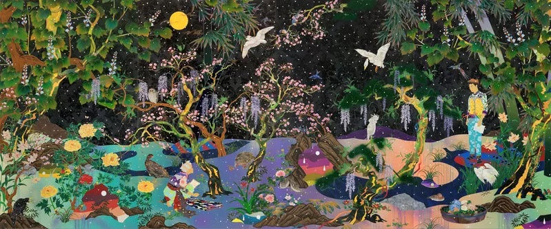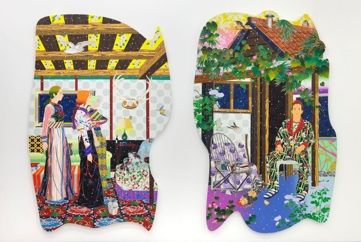Tomokazu Matsuyama, Beautiful Stranger Beyond the Sunshine / Nothing's Burning Underground, 2018. Acrylic and mixed media on canvas, 67 x 105 x 1 1/2 in. / 68 x 105 x 1 1/2 in.