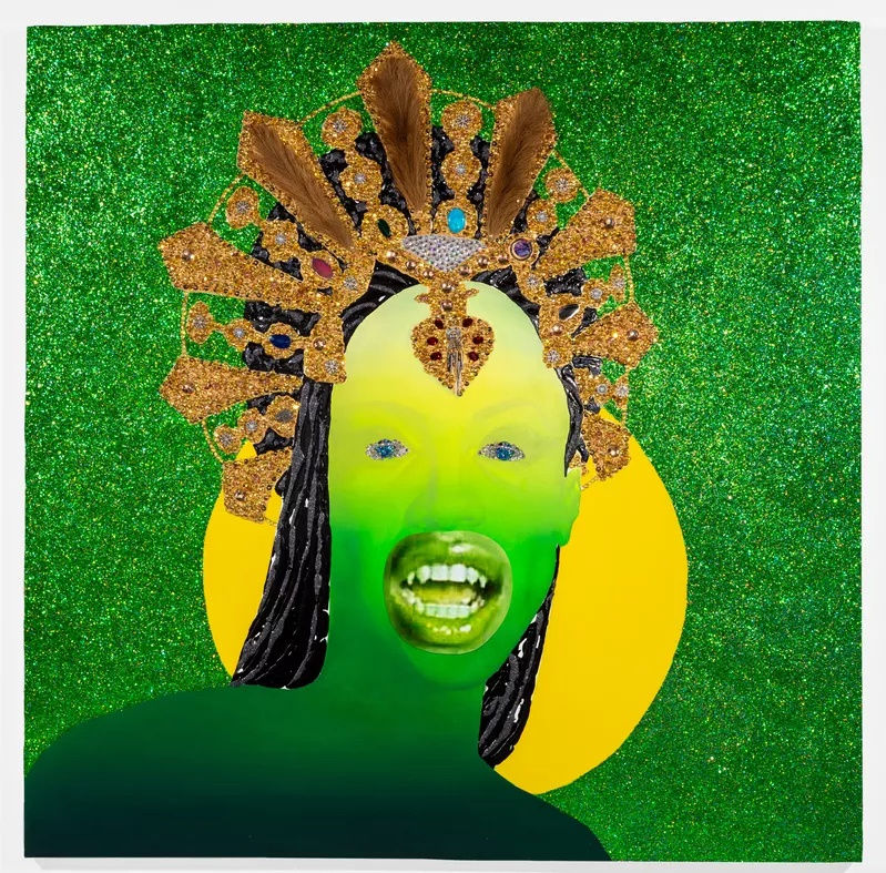 The artist has become renowned for his portraiture, whether of himself, his friends and acquaintances or what comes out of his imagination. He cites the rigorous conventions of old masters such as Goya and Caravaggio as influences, as well as Wangechi Mutu's fantastical collages and Kehinde Wiley's bright paintings. On his canvases , smooth expanses of color are formed from oils, acrylic, and pencil, while photographs may be used for eyes or mouths, accentuating these facial features. Then come the textural materials such as Swarovski crystals, fur, glitter, fabrics, and gemstones-demonstrating a magpie eye that was originally fostered by his grandmother's taste in costume jewelery, ritzy tablecloths, and best china.