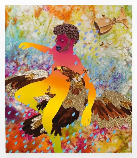 Devan Shimoyama, The Abduction of Ganymede, 2019. Oil, colored pencil, dye, sequins, collage, glitter, and jewelry on canvas, 84 x 72 in. Courtesy of the artist and DeBuck Gallery.
