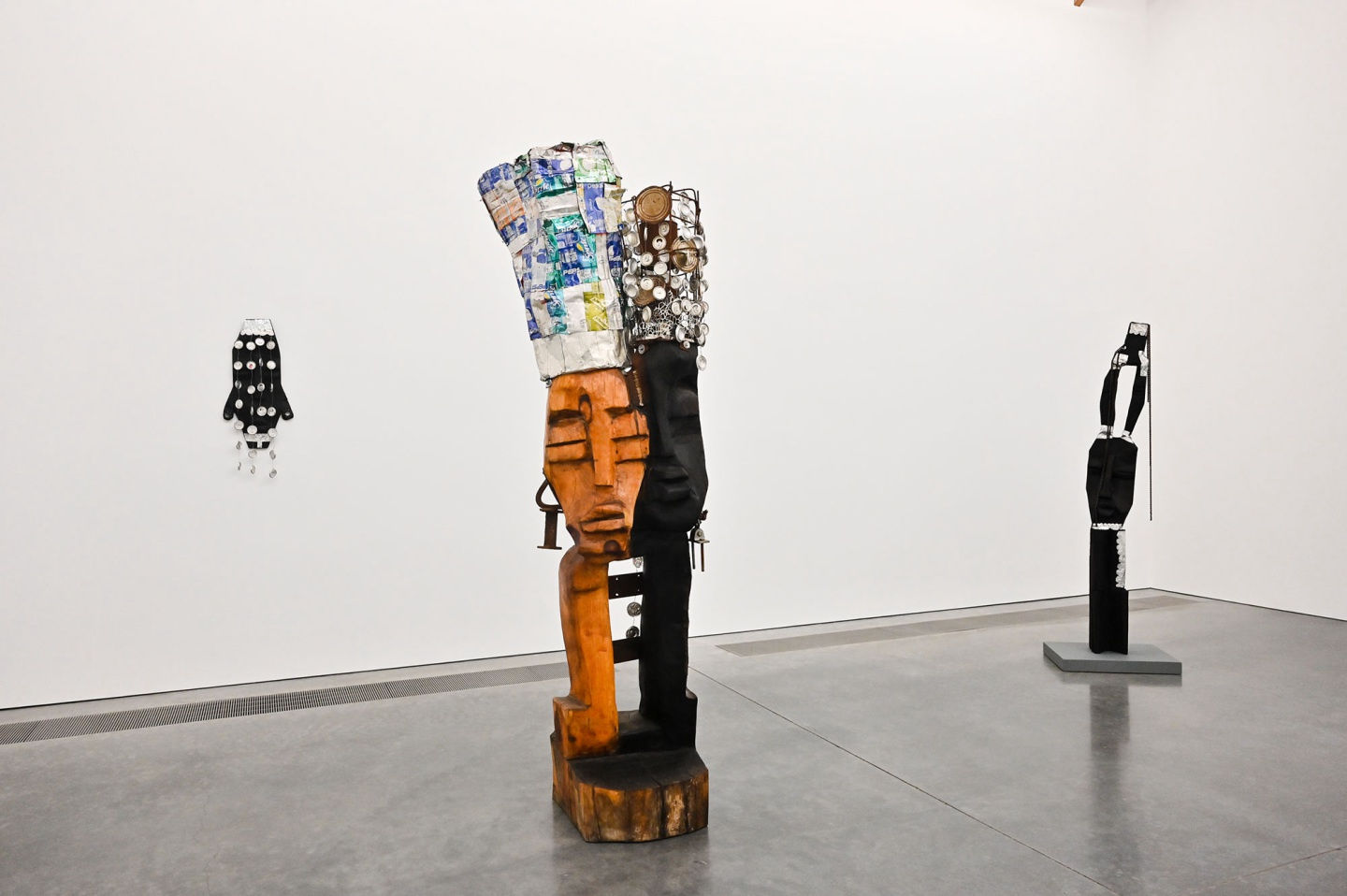 These two pairings—Dyson and Rasheed; Yanko and Olivier—are where the thoughtful curation by Racquel Chevremont and Mickalene Thomas (Deux Femmes Noires) is most evident: the works’ placement discovers assonances that refract through each. Artists February James and Leilah Babirye are allotted a whole room each, where the tempo of the exhibition slows. Babirye’s sculptures are complex pairings in themselves. They draw together the aesthetic traditions of Kampala, Uganda, where she was born and grew up, and debris found in her current home of New York City; they unify the experience of being African and the experience of being gay; they combine traditional sculptural techniques with modern materials suggesting different forms of technical mediation. Wooden figures are enmeshed with flattened soft drink cans, wires, bike chains, clamps and bolts.