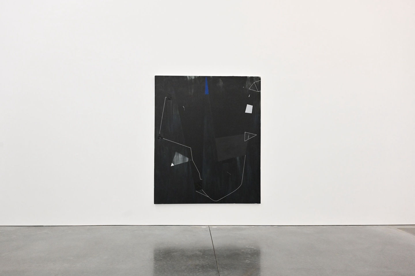 Accordingly, some of the canvases acquire architectural dimension. They are like plans or renders of future and past buildings, though they sublimate this suggestion of habitation into deep slicks of glossy black paint. In The Horizon 01 (2017) and The Horizon 02 (2017), the paintings’ awareness of space reaches beyond the rooms and to the wide outside, somewhat like the tall windows built into the gallery’s walls reveal the surrounding landscape, green-gray and whipped by occasional rain on the day I visited.