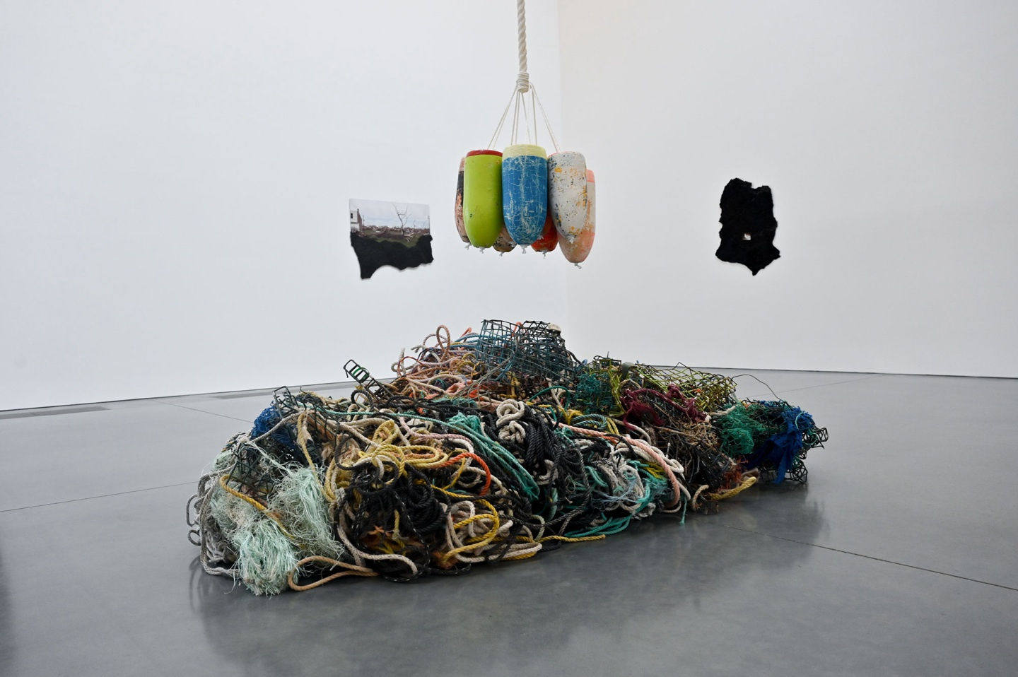 In Olivier’s work there’s also an ambivalence between embrace and threat. An asphalt substance customarily used as tar roofing engulfs or cocoons photographs of unprepossessing fragments of urban assemblages: corners of buildings with walkways on which tiny figures slouch on benches, a felled tree surrounded by drab houses, stacks of bricks with apparently discarded clothes. These images may have private significance, or they could just as easily mean nothing, but now, clasped in tar, these vignettes suggest convergences between accident and intention; tricks of sentiment, light or perception, and fleeting senses of home. In the middle of the gallery, How Many Ways Can You Disappear(2021) is a pile of ropes, traps and buoys. With tarred photographs all around me, I thought about the artist as a fisher of moments, sunk in an anonymous urban ocean. But on reading about the work, I discover that Olivier herself had cast her mind further back, thinking of the sea salt traded for slaves in Ancient Greece. Like the juxtapositions in the photographs, both strange and mundane, trade and domination produce surreal equivalences that structure everyday life.