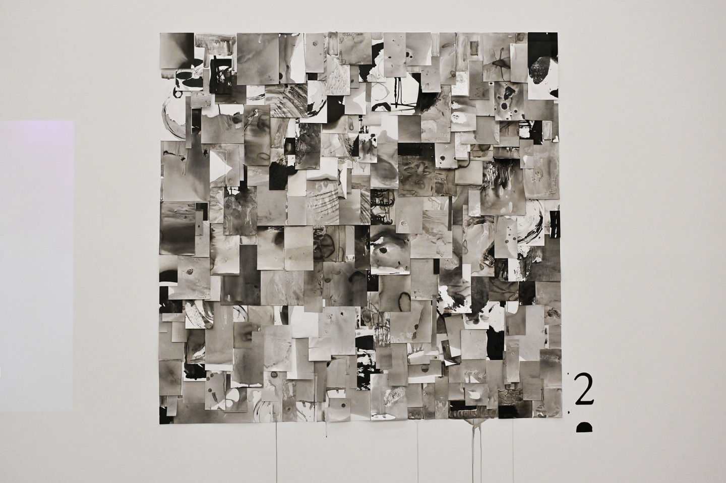 Dyson’s paintings deepen the more you look at them while across the room, Kameelah Janan Rasheed’s work also asks for long consideration to allow torn-apart fragments of language to cohere into new meaning. Perhaps in this body of work the show’s claim to the consideration of the spatial has to reach the furthest, but space here is formulated as a function of language. The diacritic—a ghostly presence in Dyson’s work—is one way to think about the role of the different elements in Rasheed’s wall-based installation, which presents a numbered progression from silent video to deconstructed painting.