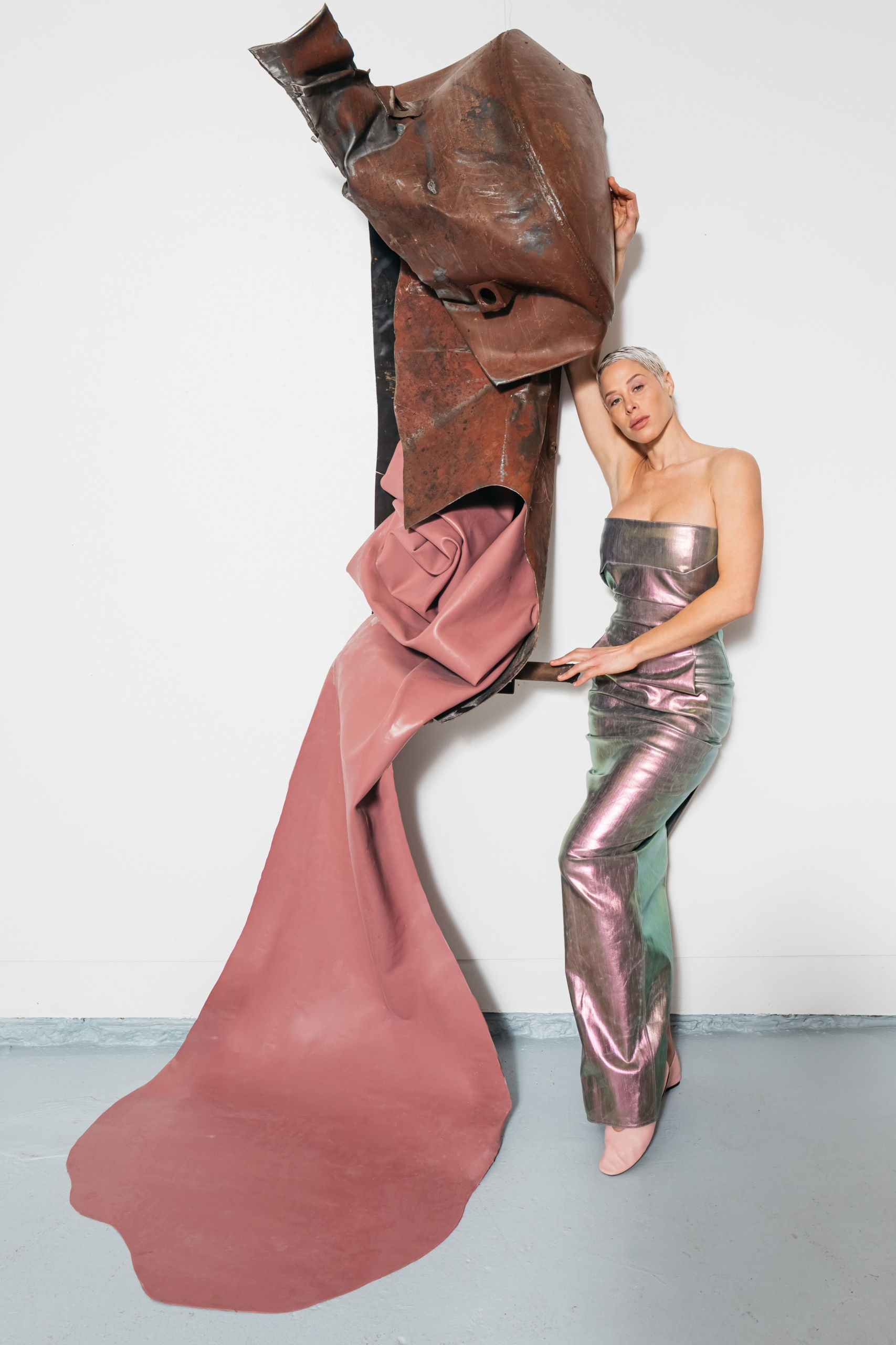 "After I pull metal and other materials from salvage yards, I sit with them in a formal dialogue. I have to understand their physical stance before I can comprehend their presence conceptually. In time, the objects’ stories reveal themselves to me. From there, I can begin to transition the material away from its previous circumstances and reposition its atomic particles (literally, and metaphorically) such that their compositions may be perceived differently and thus newly defined," says Yanko. To accompany the opening of the exhibition, photographer Mike Vitelli captured Yanko in avant-garde fashion pieces surrounded by the work on view.
