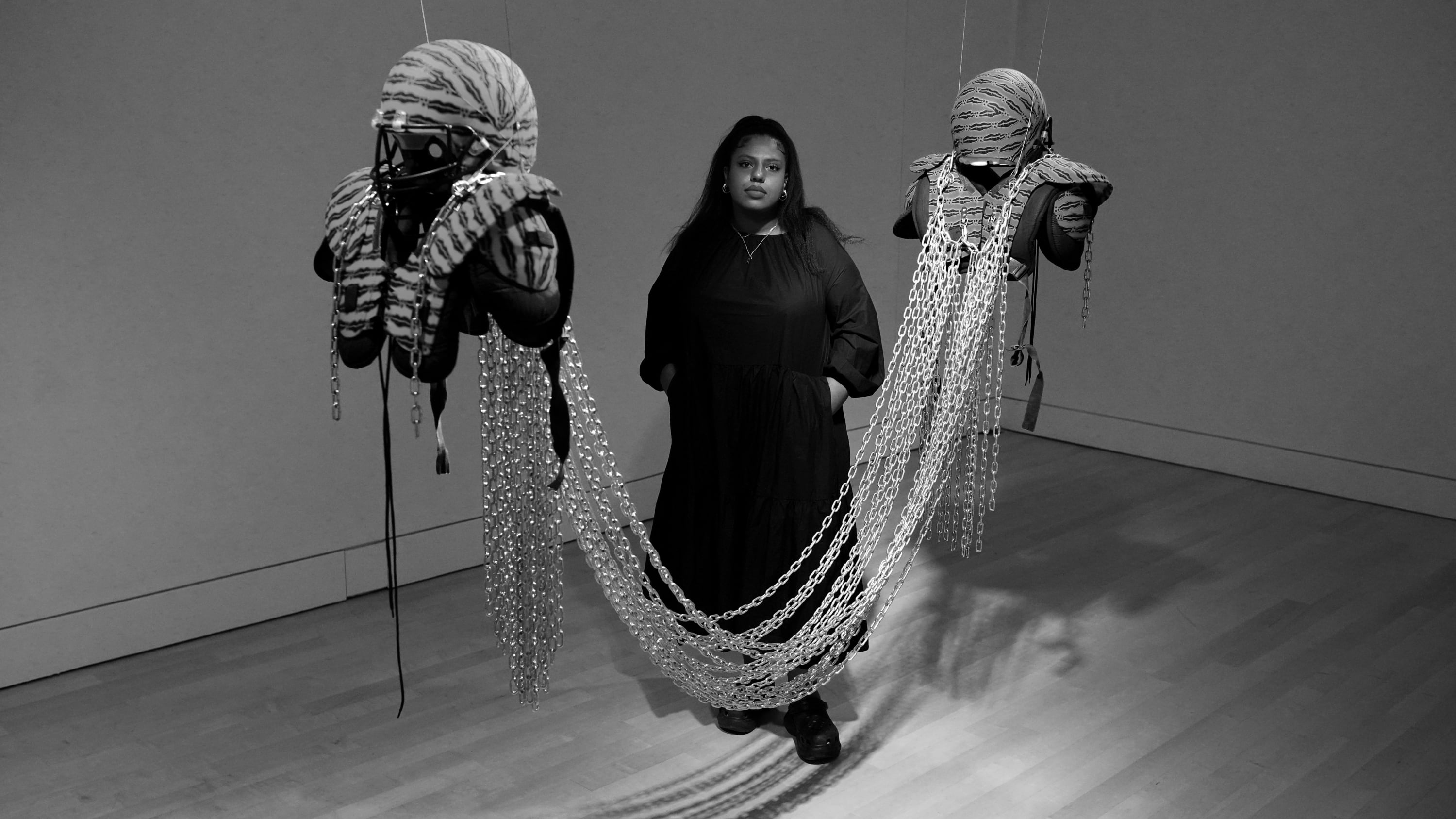 Mohamoud’s colossal pink Cadillac sculpture, titled Nirvana (Oh, Sweet Elham), perches on steel rims so massive that viewers can walk under its glossy chassis. From there, they can see that the guts of the car have been removed, rendering it useless as a conveyance. The work was initially inspired by a miniature black Cadillac VHS tape rewinder once owned by Mohamoud’s grandmother Elham. Examining her childhood memories of watching movies with her grandmother and rewinding them in that little car prompted Mohamoud to research how Cadillacs became an iconic part of Black culture. She learned how Black people were systematically barred from purchasing luxury automobiles in the early 20th century.Threatened by slumping sales as wealthy White people lost their fortunes in the Great Depression, Cadillac broke the trend, becoming the first luxury car brand in America to directly market and sell to Black consumers. Mohamoud underscores the literal emptiness of Nirvana (Oh, Sweet Elham) with symbolic custom additions. Hidden speakers broadcasting ghostly melodies through the void; an American flag vanity license plate bearing the slogan In God We Trust; and a dazzling but inoperative chrome steering wheel become tokens of the strange currencies of visibility, status, and shine. -