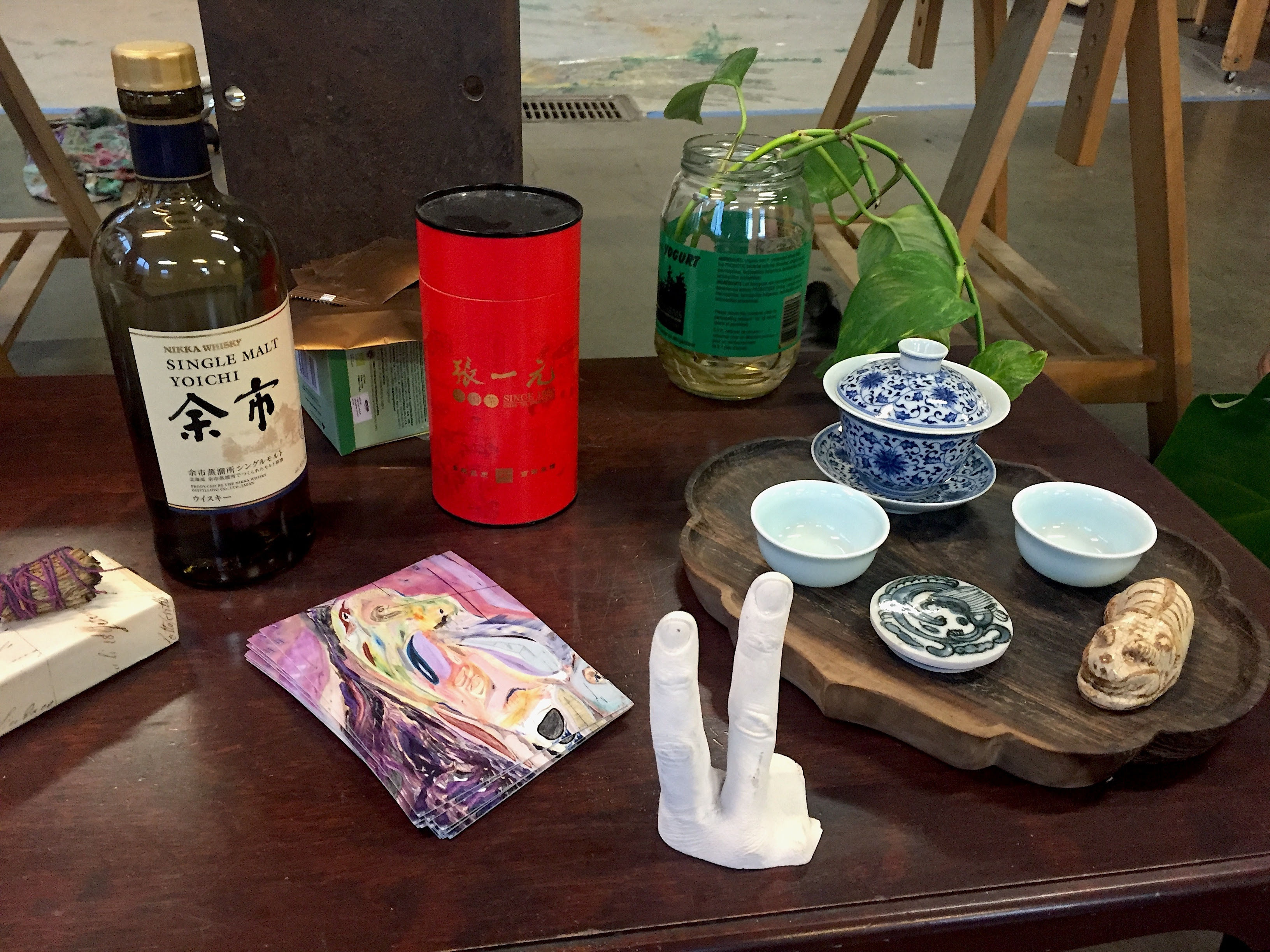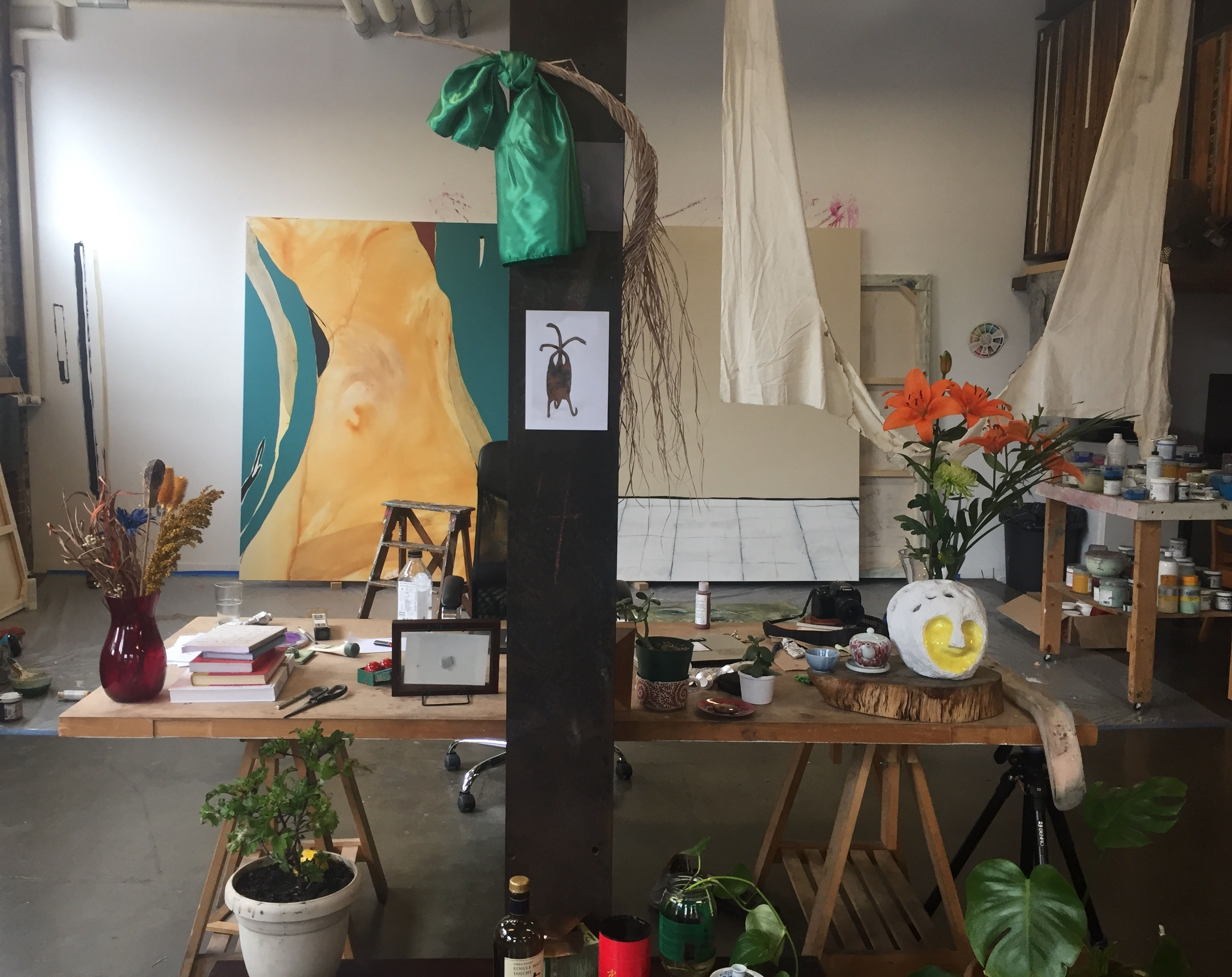 A view of Mathieu's side table in his studio in Montreal, Canada, 2020.
