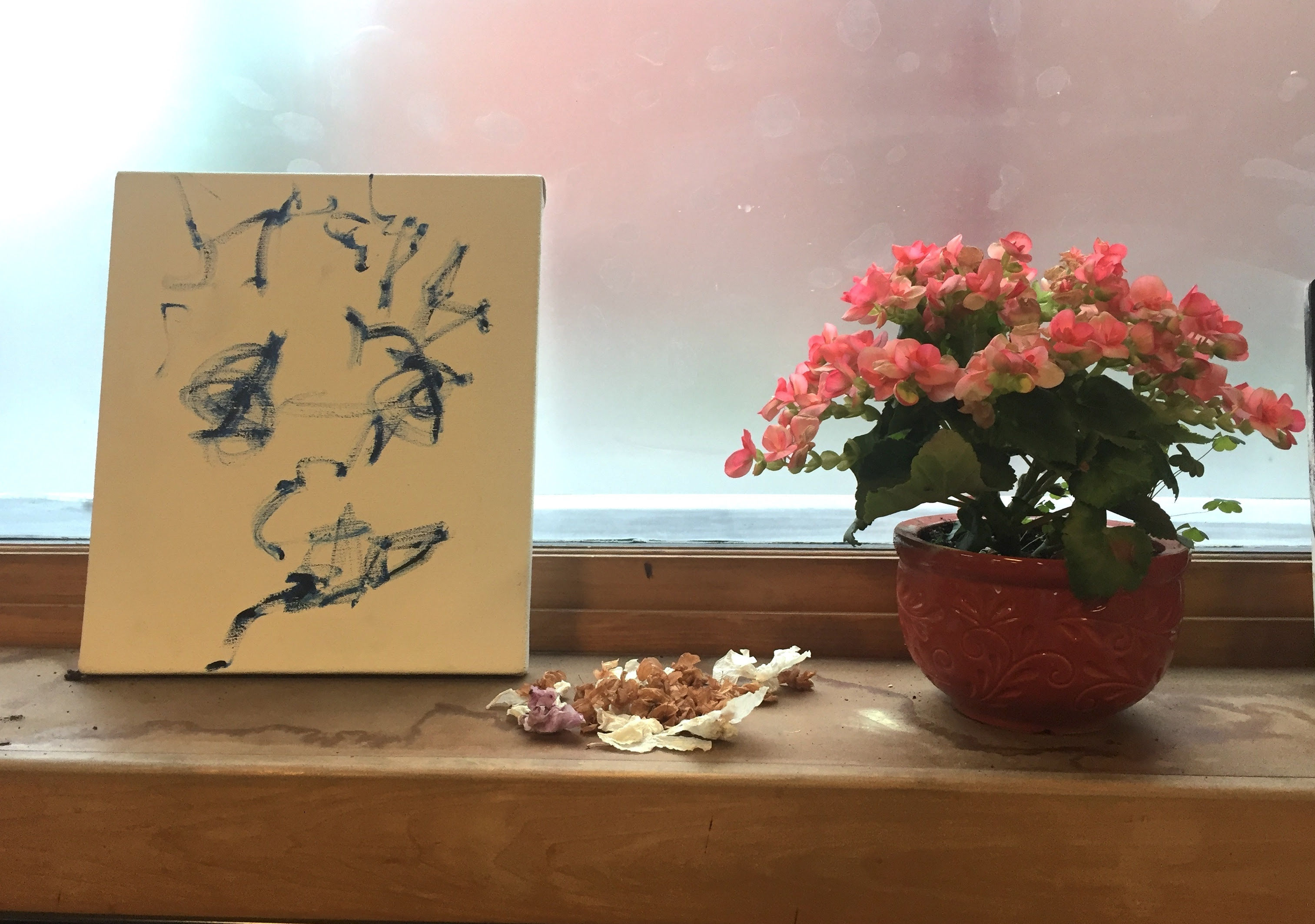 A calligraphic drawing sits beside a flowering plant in the window sill of Mathieu's studio in Montreal, Canada.